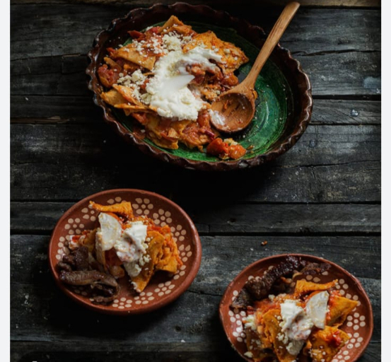 Chilaquiles crujientes bañados en salsa de chile serrano y tomate verde que no pica, con crema, queso, frijoles y pan, (545 g).