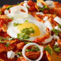Chilaquiles crujientes bañados en salsa de chile serrano y tomate rojo, ligeramente picosa, con crema, queso, frijoles y pan, (545 g).