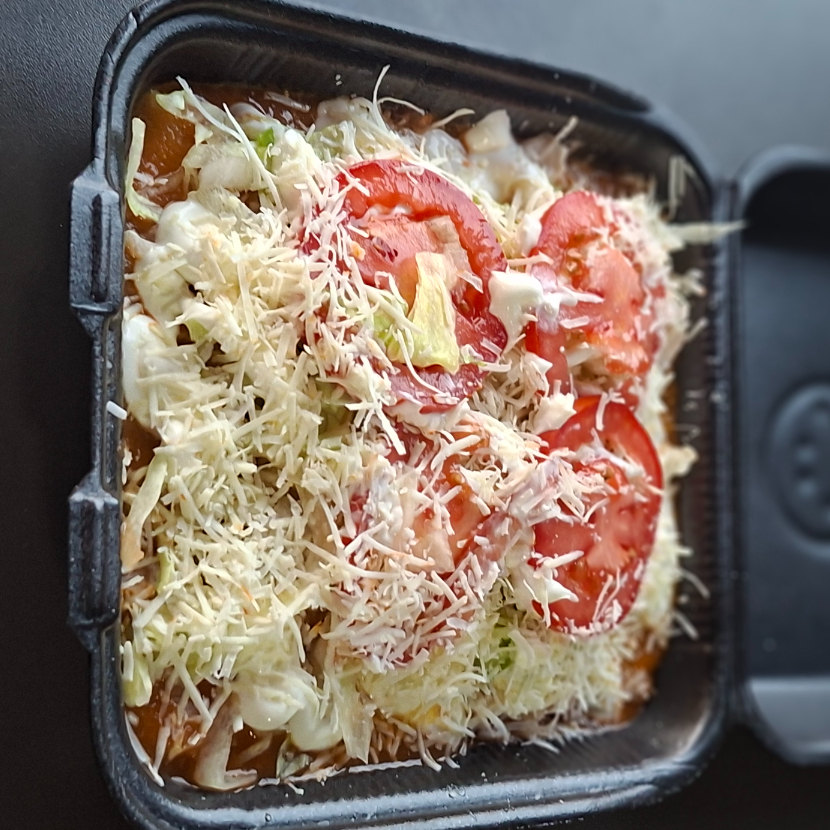 Torta rellena de chilaquiles en salsa roja ligeramente picante, frijoles, crema, queso y lechuga.
