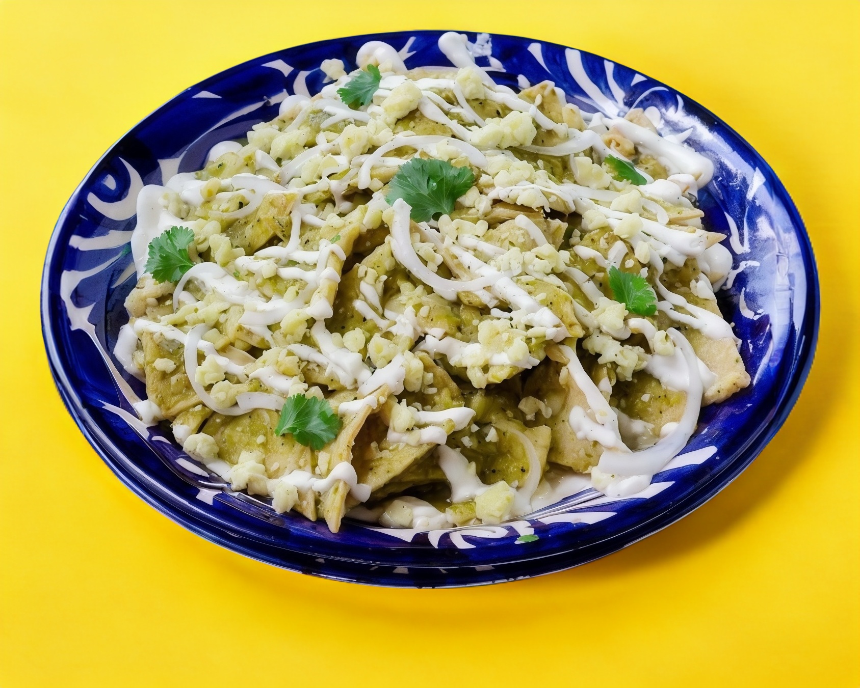Tortilla frita cortada en triángulos bañada en una deliciosa salsa verde tradicional casera. Acompañados de crema, queso, cilantro y cebolla.