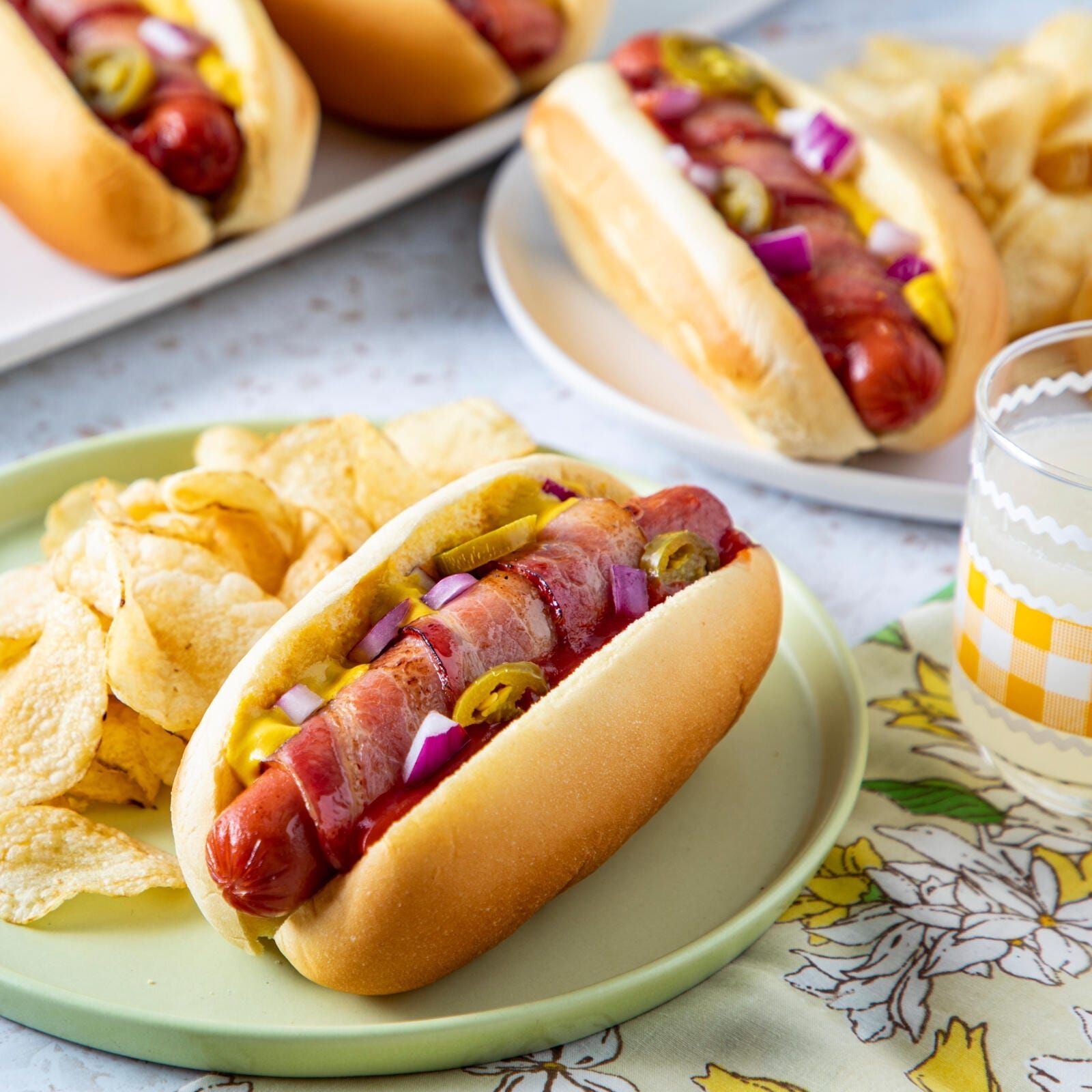 Pan de hot dog, salchicha jumbo envuelta en tocino y queso manchego, ketchup y cebolla caramelizada