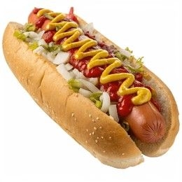 Pan de hot dog, salchicha jumbo, mostaza, ketchup, cebolla, tomate