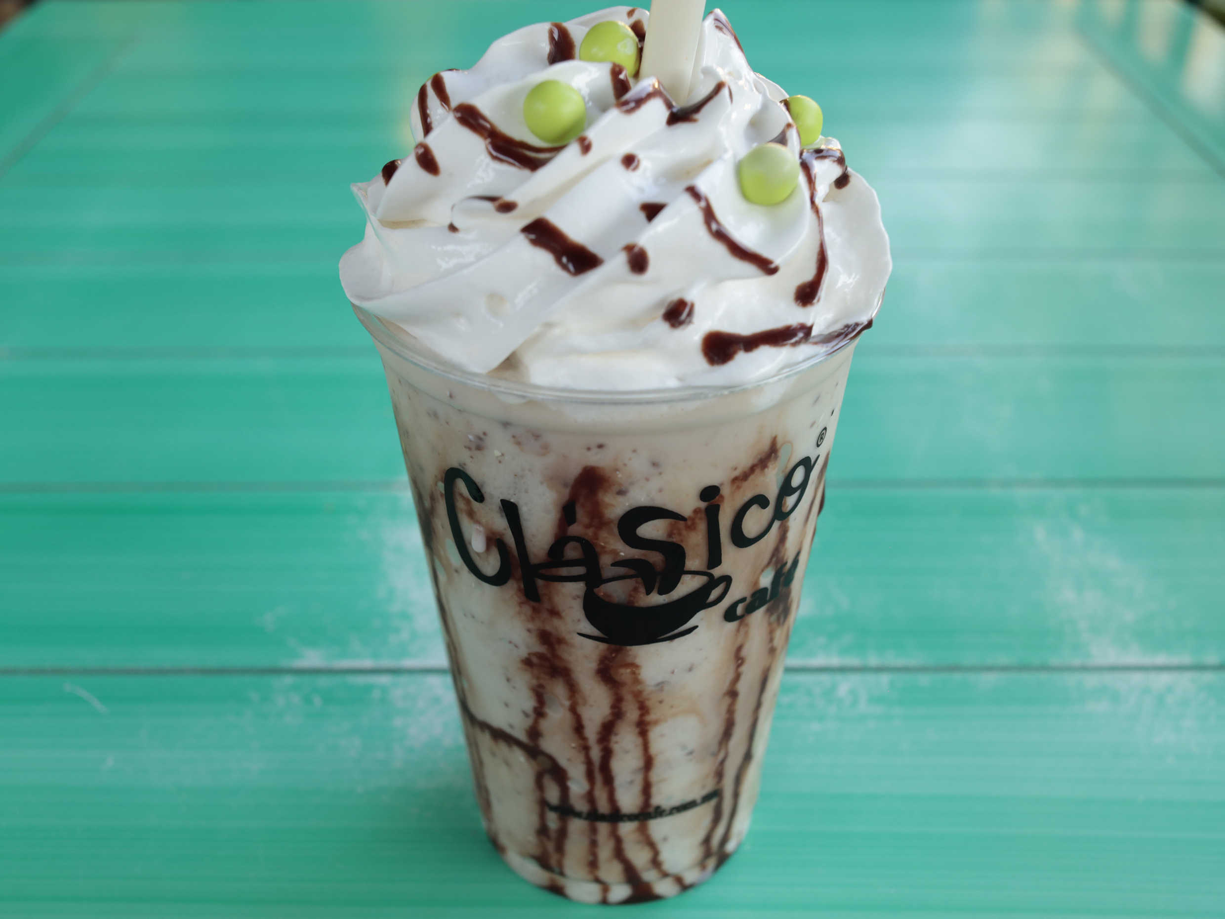 Frappé sabor te chai con leche a elegir, con crema batida y decorado de chocolate.