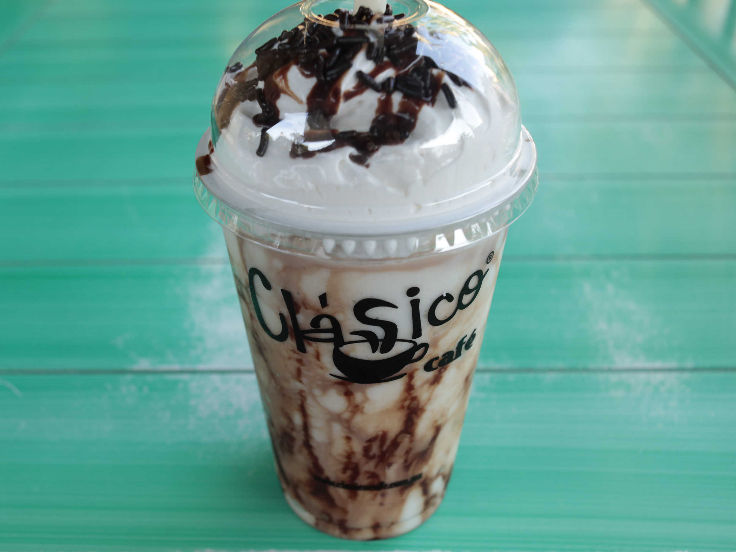 Frappé capuccino de 355 ml. frappé hecho con espresso recién molido, leche a su elección y crema batida, decorado de chocolate y chispas de chocolate.