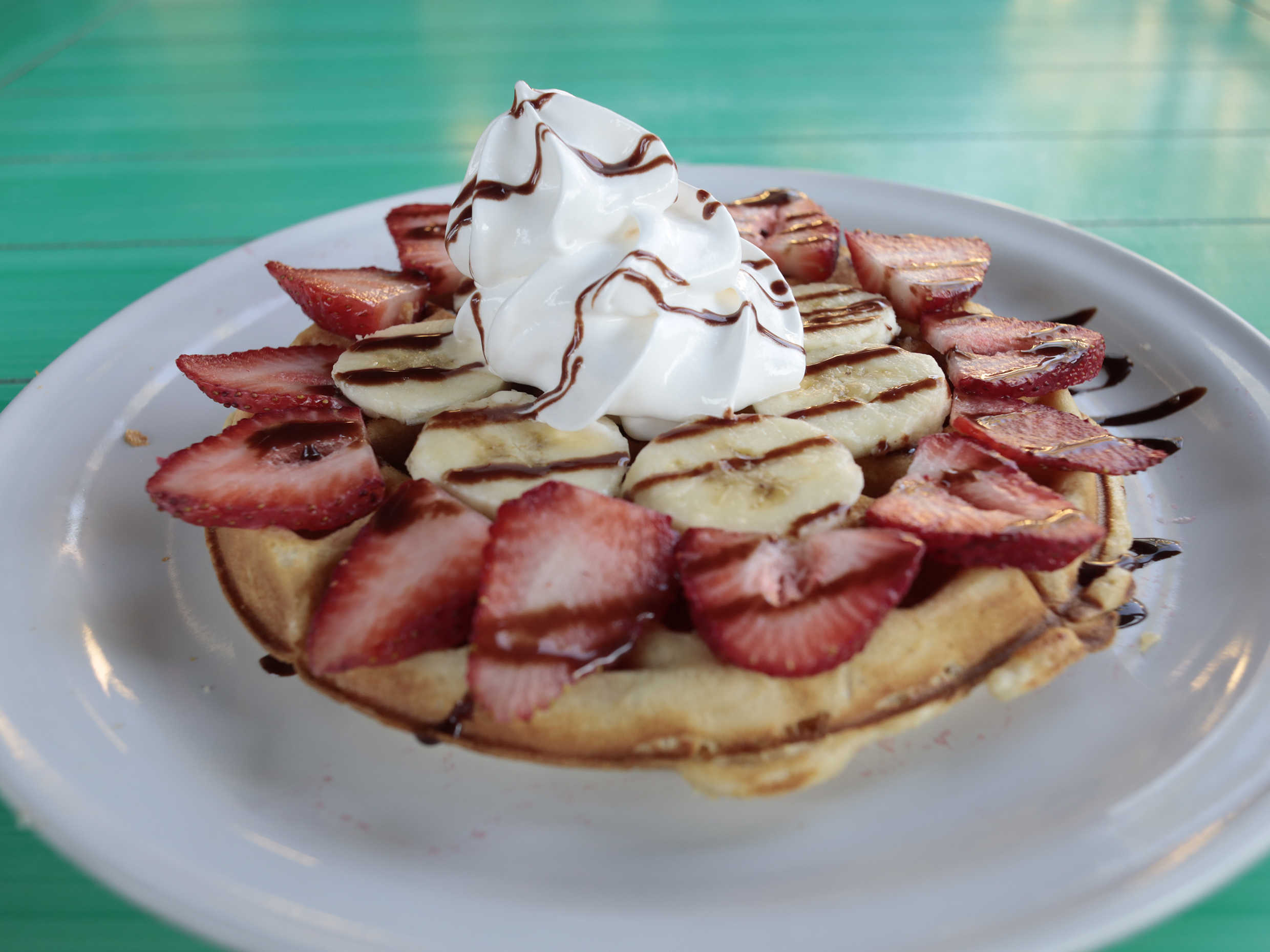 Waffle de 18 cm. de diametro con 2 ingrediente a elegir, con crema batida y decorado de chocolate liquido.