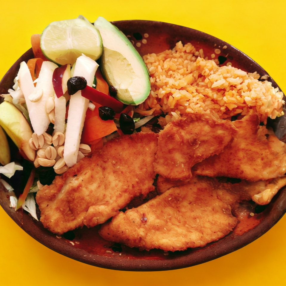 Jugosas pechugas en milanesa empanizada con la receta secreta de la casa + medio litro de agua de fruta natural del día