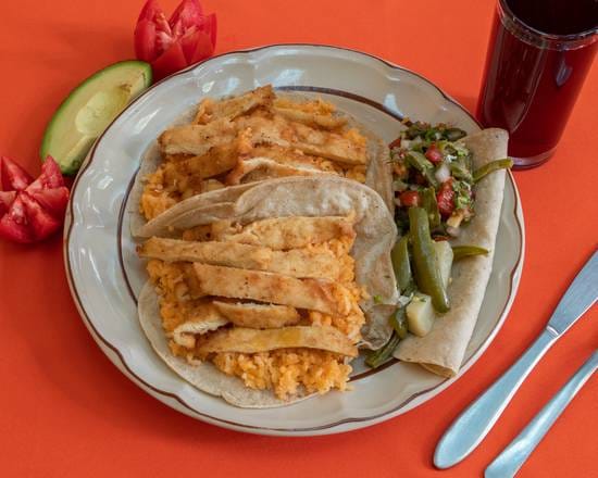 Platillo de pechuga asada acompañado de guarniciones a elegir con 3 tortillas a mano.