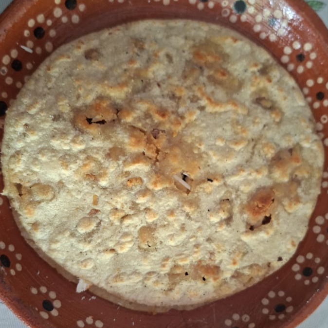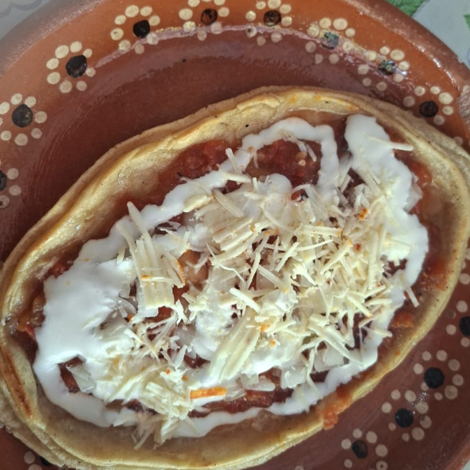 Base gruesa de maíz recién hecha, untada con frijoles refritos y servida con crema, queso fresco y salsa al gusto roja o verde.