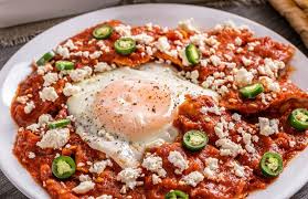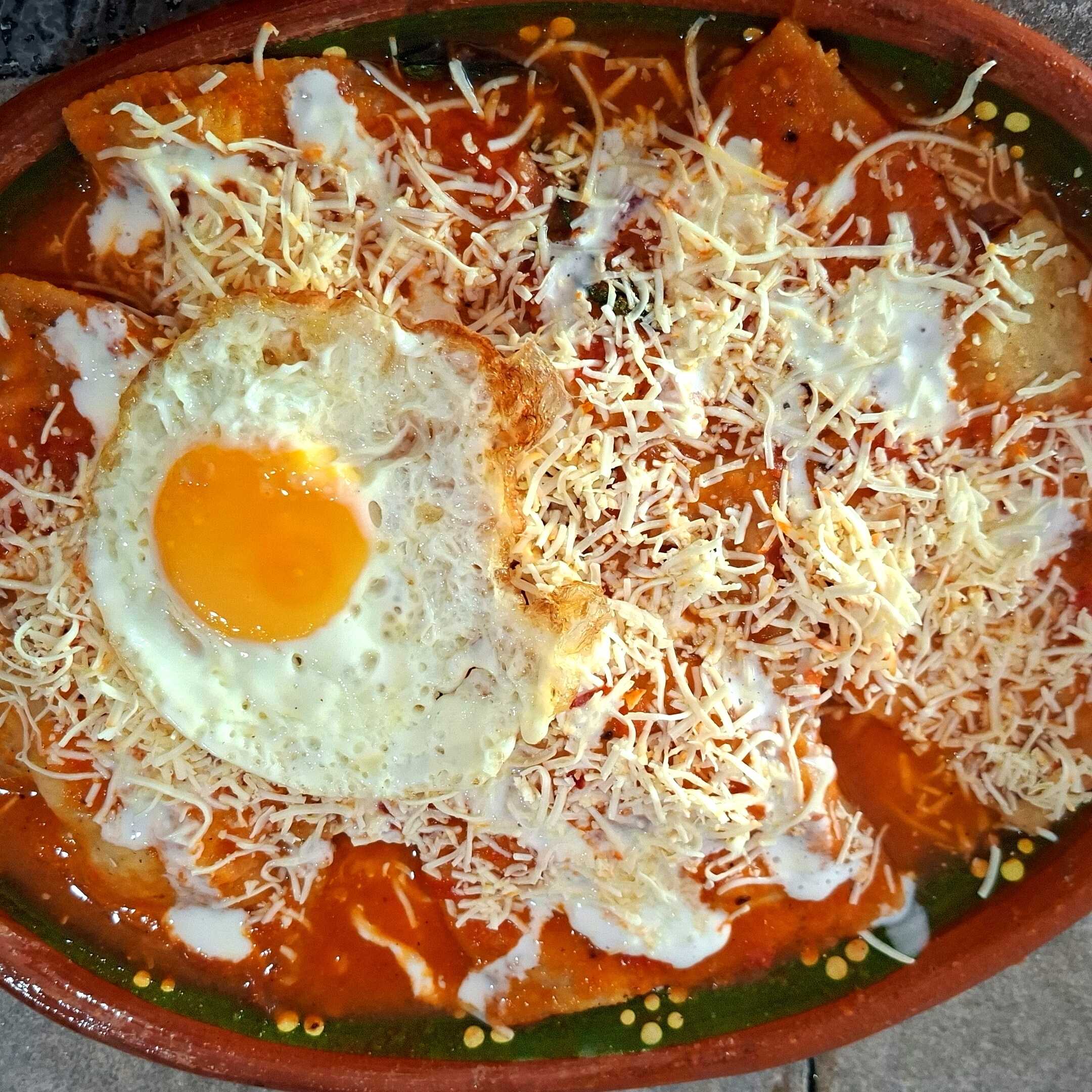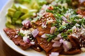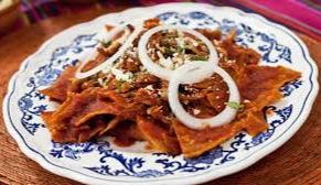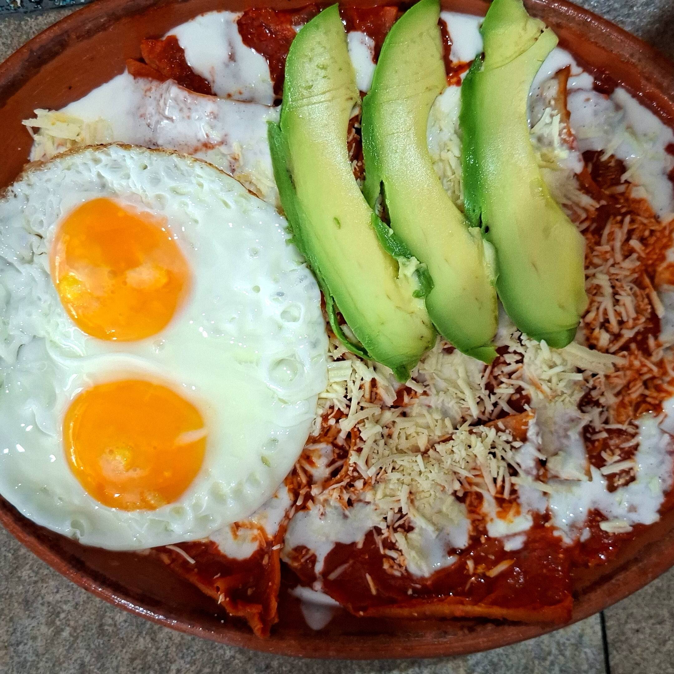 Totopos bañados en salsa guajillo, con crema, queso y cebolla, dos huevos al gusto.