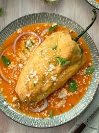 Chile poblano relleno de queso fresco o carne molida 100 gramos, capeado y bañado en salsa de jitomate.