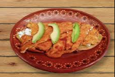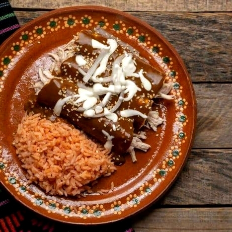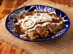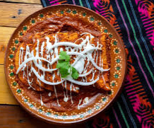 Pollo deshebrado 100 gramos, tortillas de maíz bañadas en mole rojo casero con un toque dulce y ligeramente picante, servidas con queso fresco, crema, cebolla morada y frijoles refritos al costado.