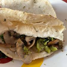 Tortilla de maíz hecha a mano, servida con crema, queso fresco, lechuga y salsa roja o verde con champiñones salteados y queso fundido.