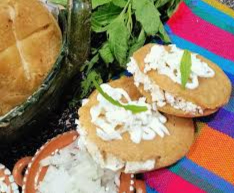 Gorditas de maíz rellenas de requesón fresco, servidas con crema, queso rayado, lechuga y salsa verde.