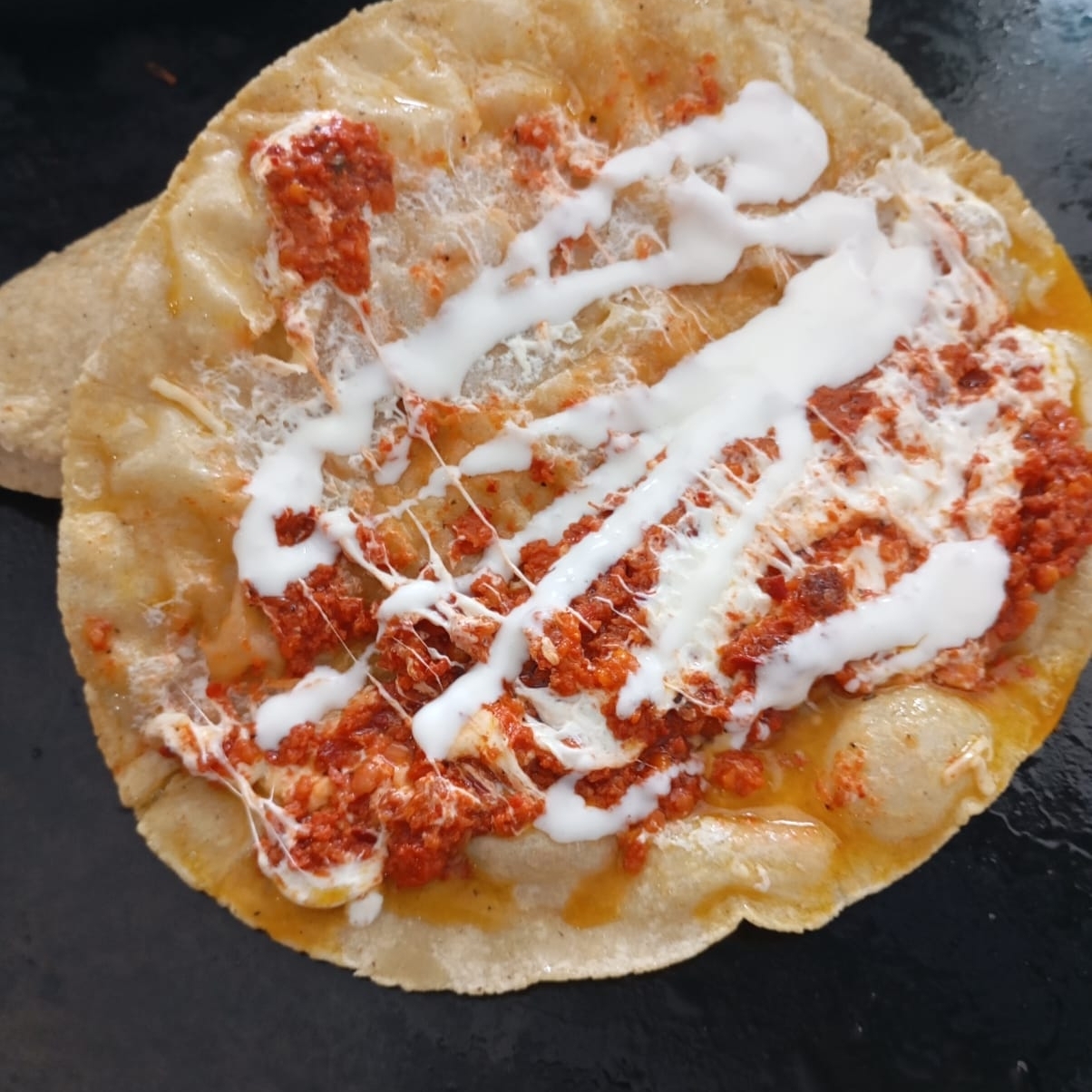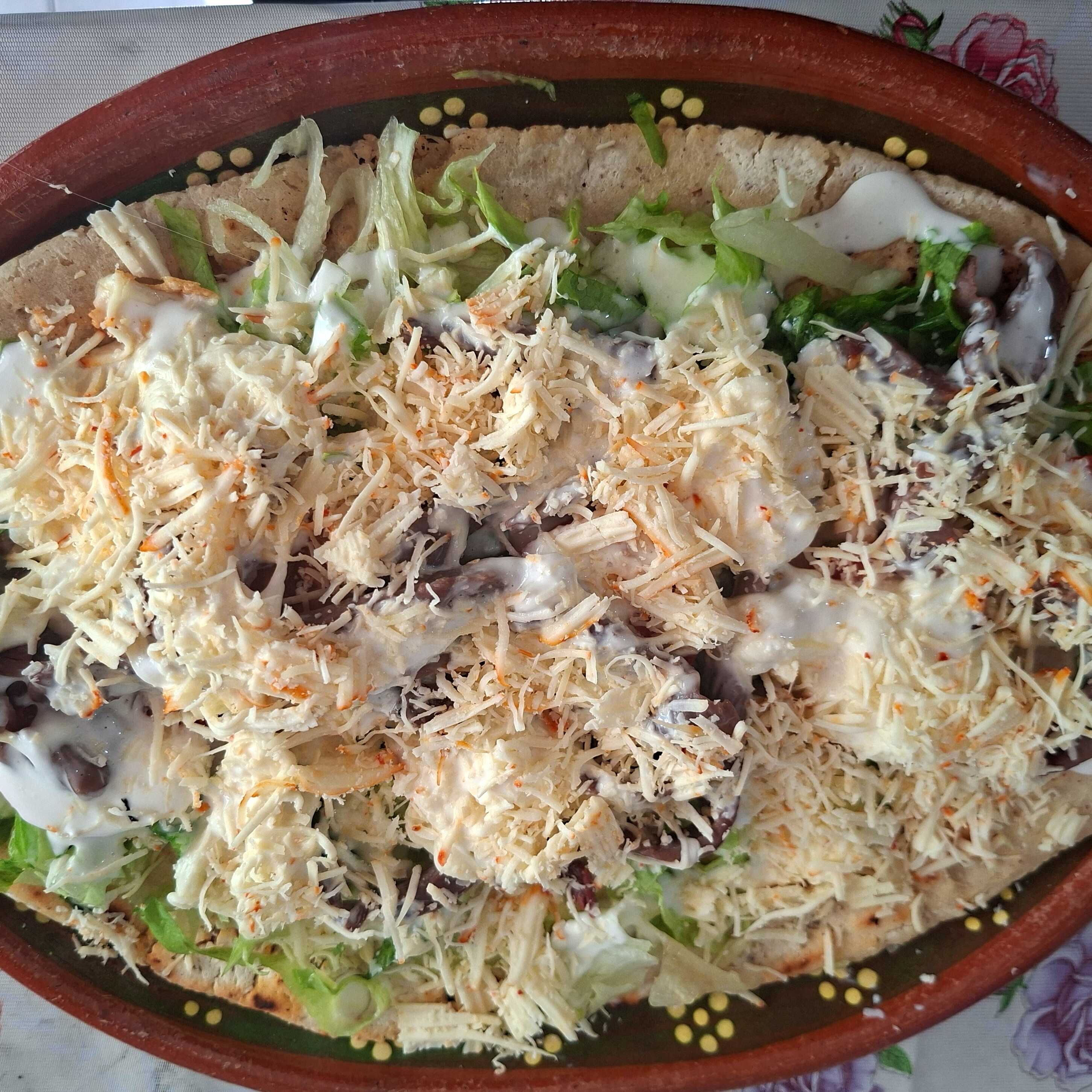 Tortilla de maíz hecha a mano, servida con crema, queso fresco, lechuga y salsa roja o verde, rellena de quesillo fundido.