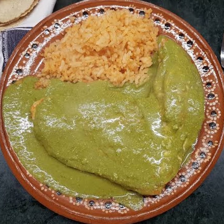 Res deshebrada 100 gramos, tortillas rellenas bañadas en salsa guajillo de tomatillo con toque casero, servidas con crema, queso fresco, cebolla y frijoles refritos al lado.