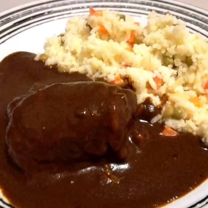 Pieza de pollo bañada en mole rojo casero, sopa de fideo seco media porción y agua de jamaica 500 ml.