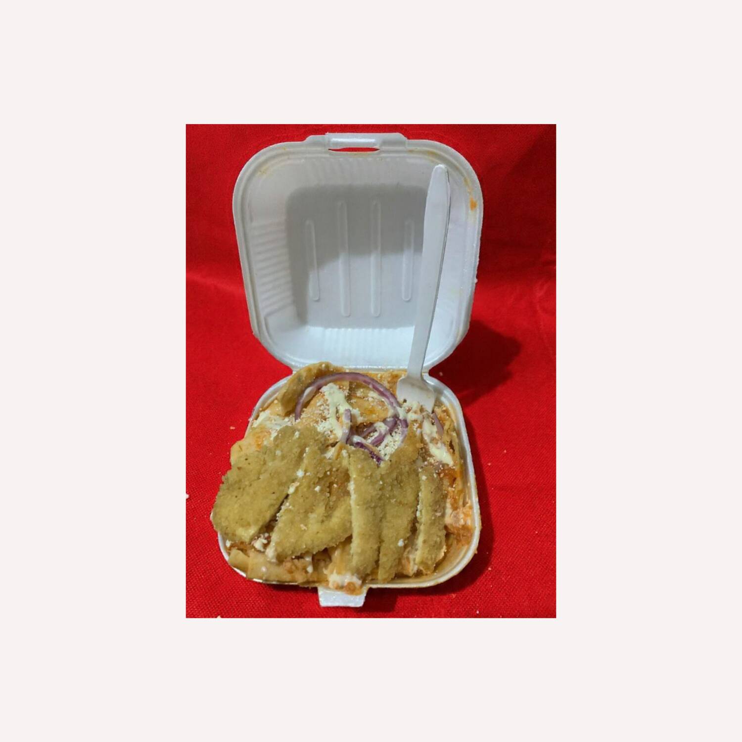 Totopos de maiz, salsa roja, cebolla, queso y crema y milanesa de pollo.