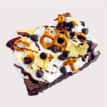 Brownie con crema pastelera, pretzels, hojuelas de papas fritas, chispas de chocolate y hershey´s líquido