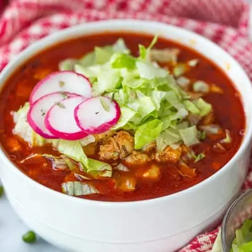 Pozole rojo, incluye rabanos, lechuga, limón, orégano