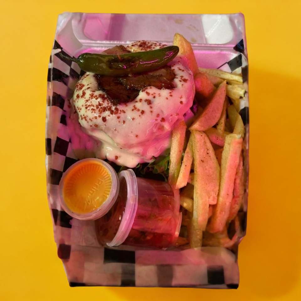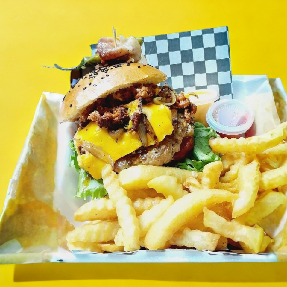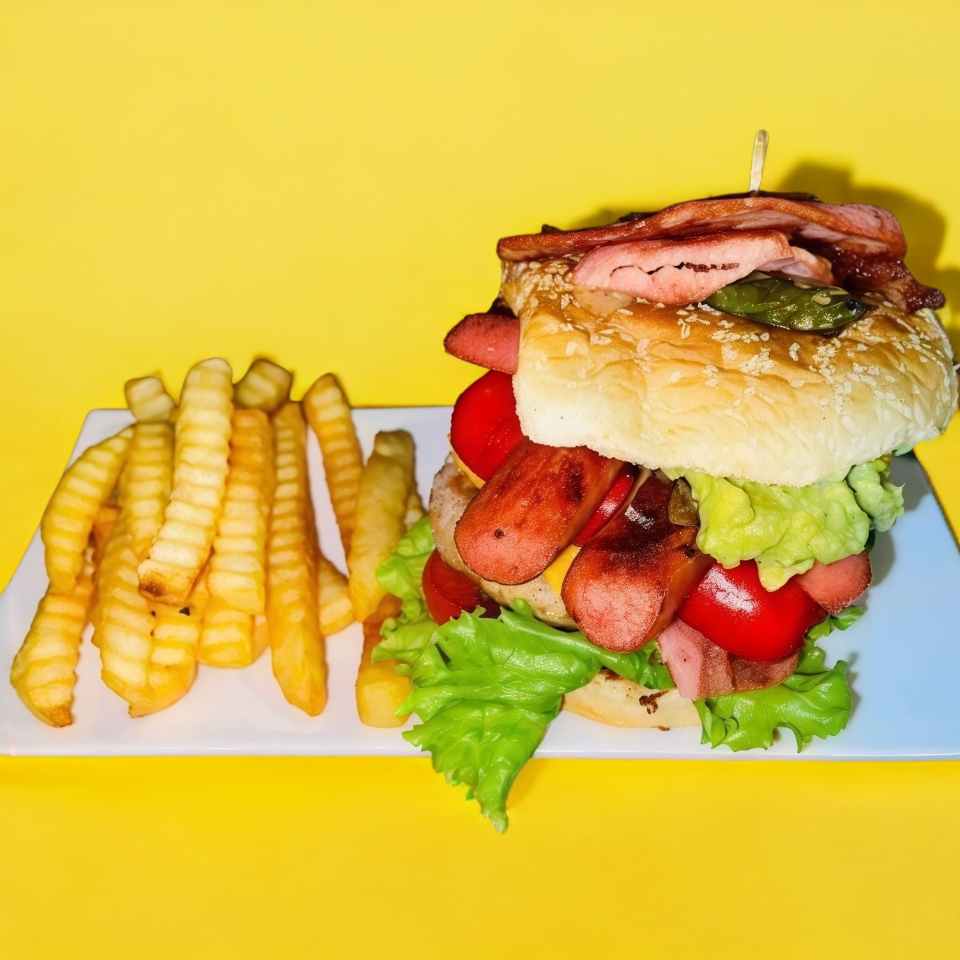 Hamburguesa CHeddar 🤪 + Hamburguesa Prime + Hot Dog Pizza + PAPAS LOCAS 🤪 + 3 Coca Cola 600 ml