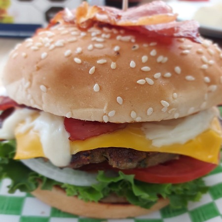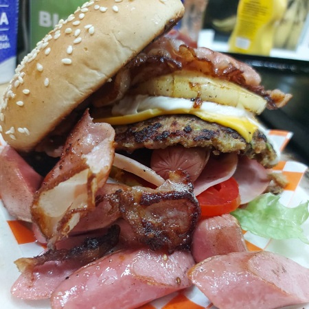 200 grs .Carne de Res, Q. Americano, Q. Oaxaca, Piña, Tocino o Jamon, Lechuga, Jitomate, Cebolla y Aderezos.
