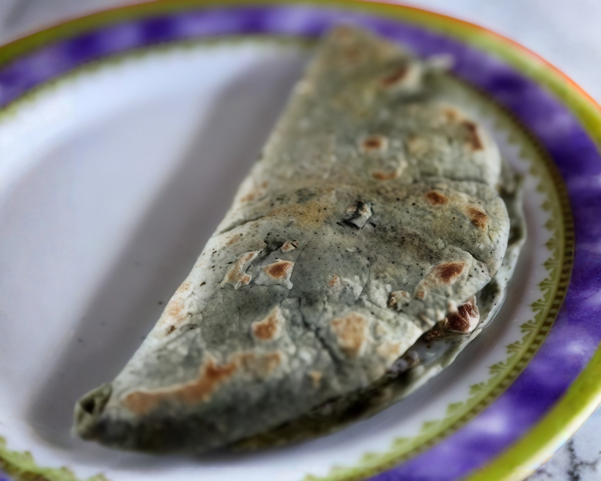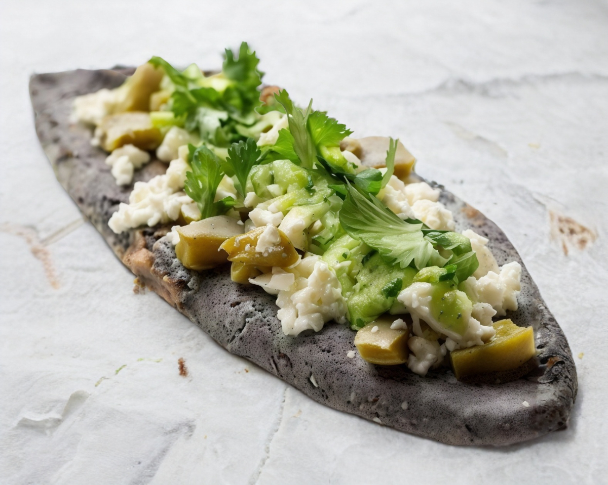 Delicioso tlacoyo acompañado con queso, crema, nopales y salsa