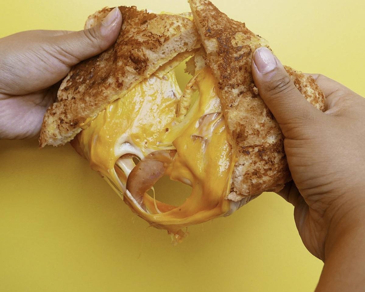 Pan brioche, huevo cremoso con queso cheddar, cebolla caramelizada, mayonesa sriracha y cebollín.