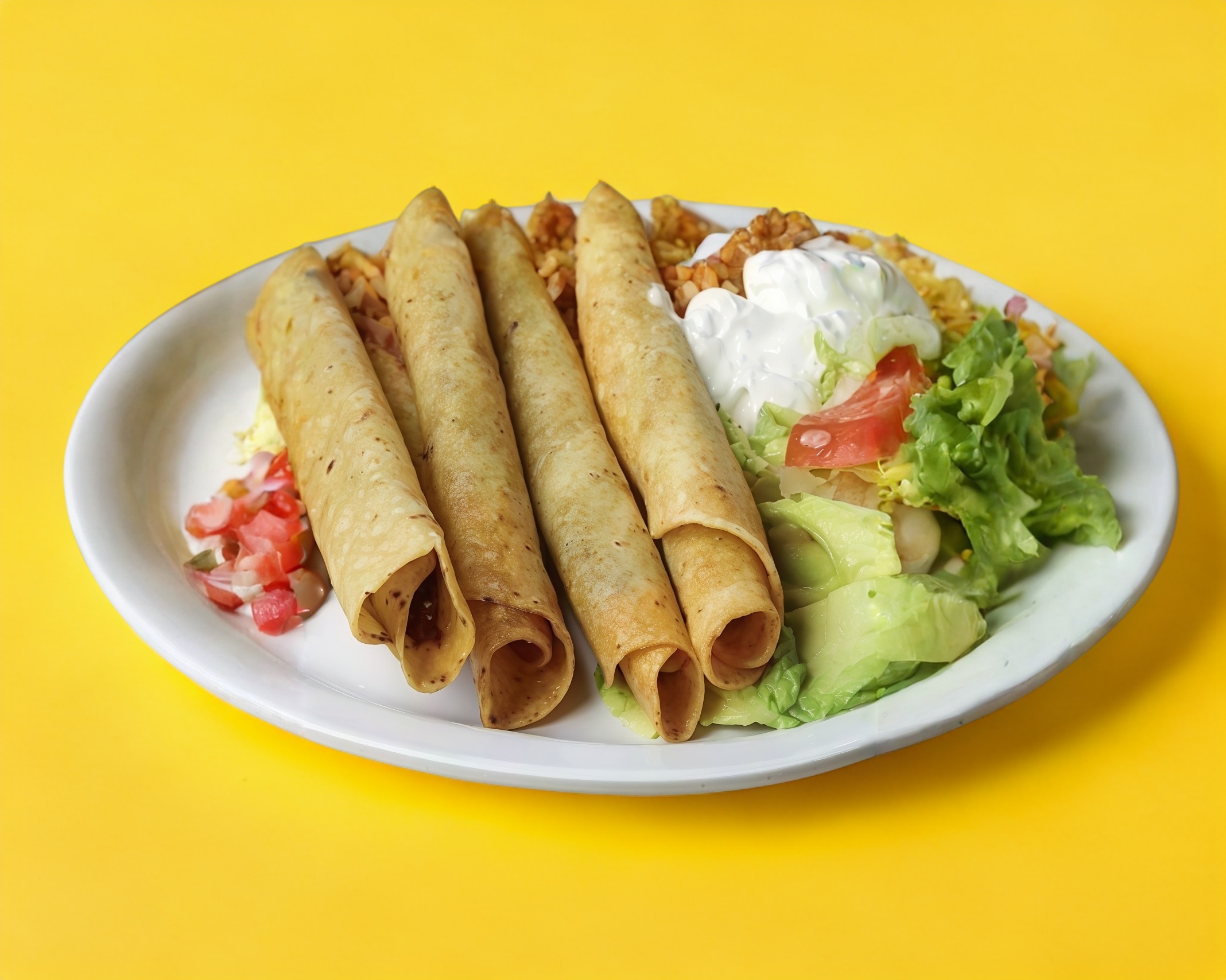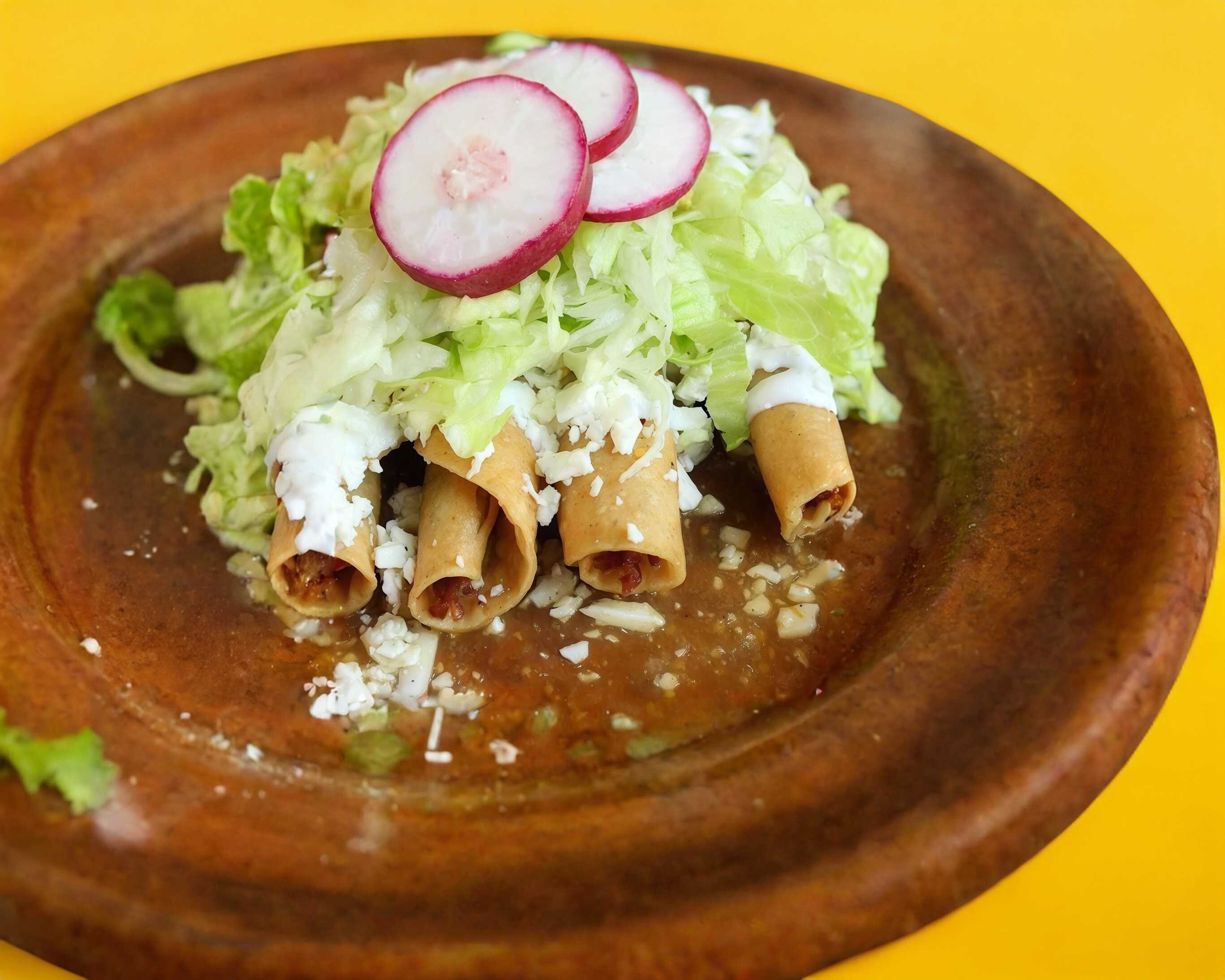 4 tacos dorados Preparados con lechuga, jitomate, cebolla, queso y salsa y crema y salsa