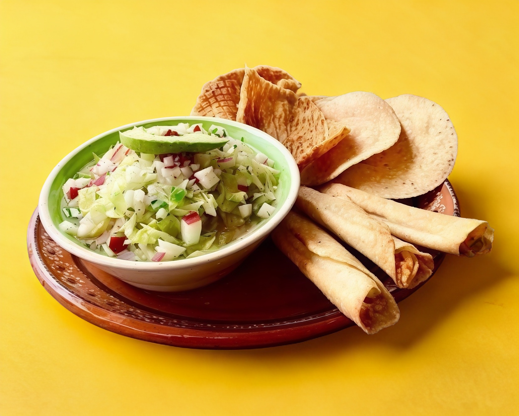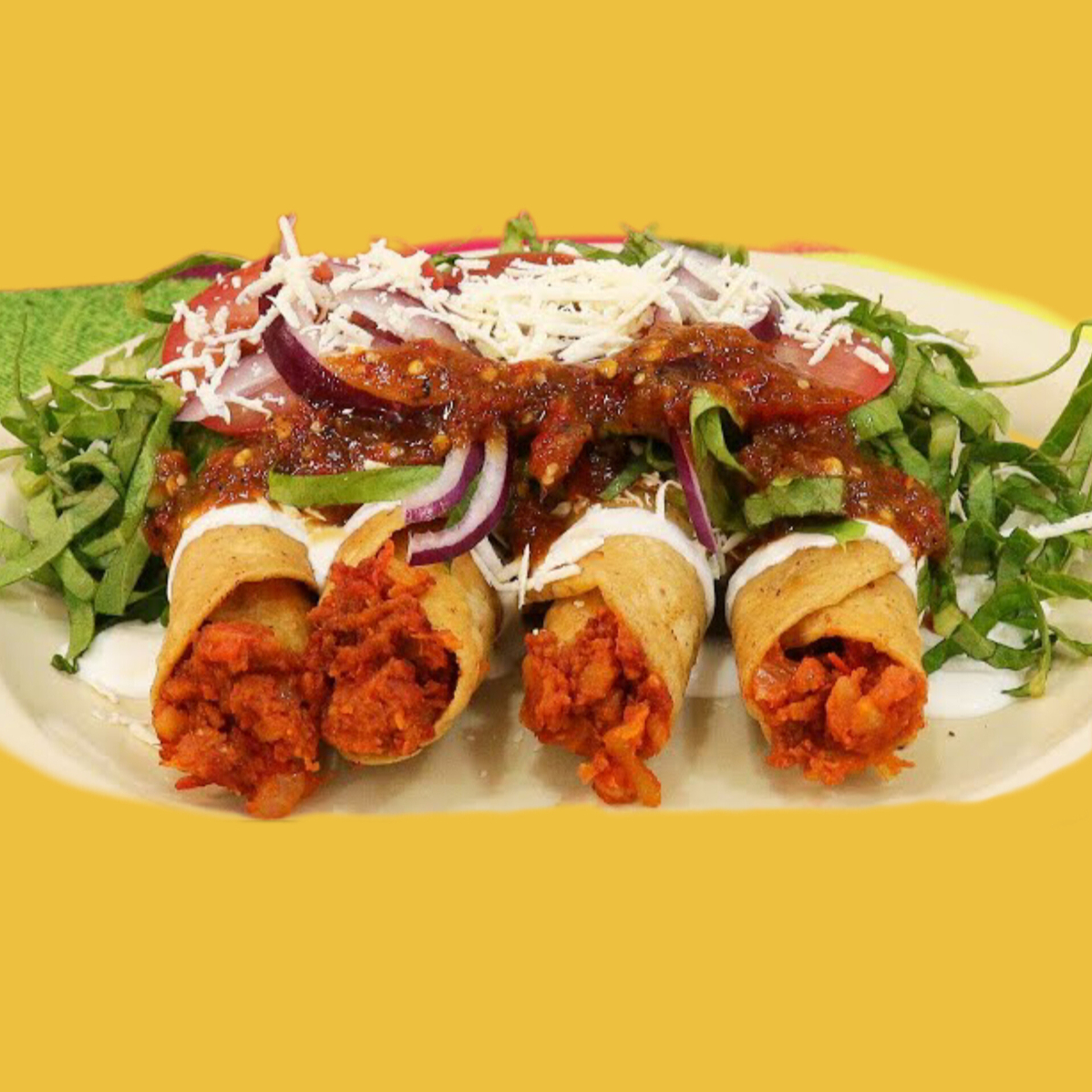 4 tacos dorados, salsa, con lechuga, cebolla, jitomate, queso y crema