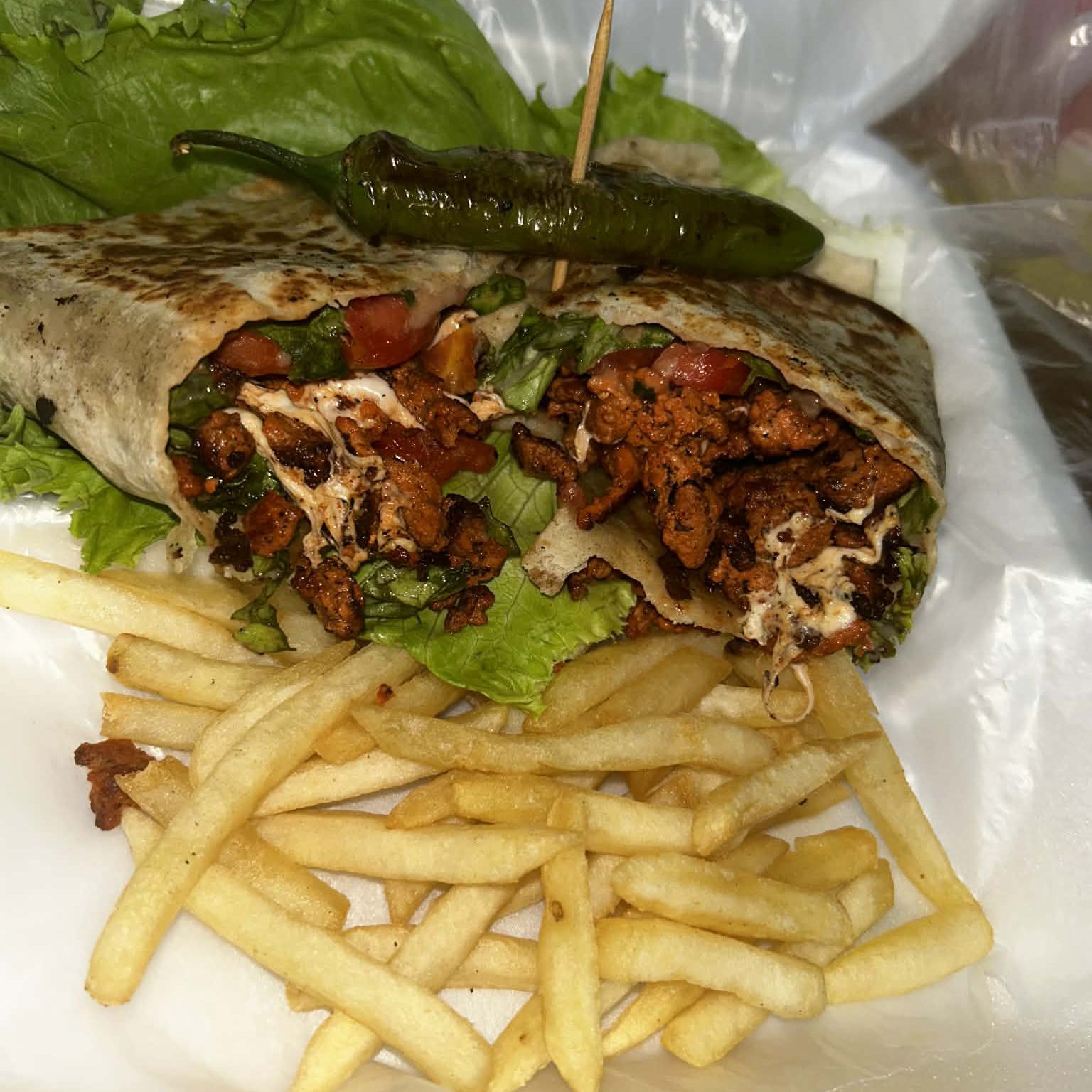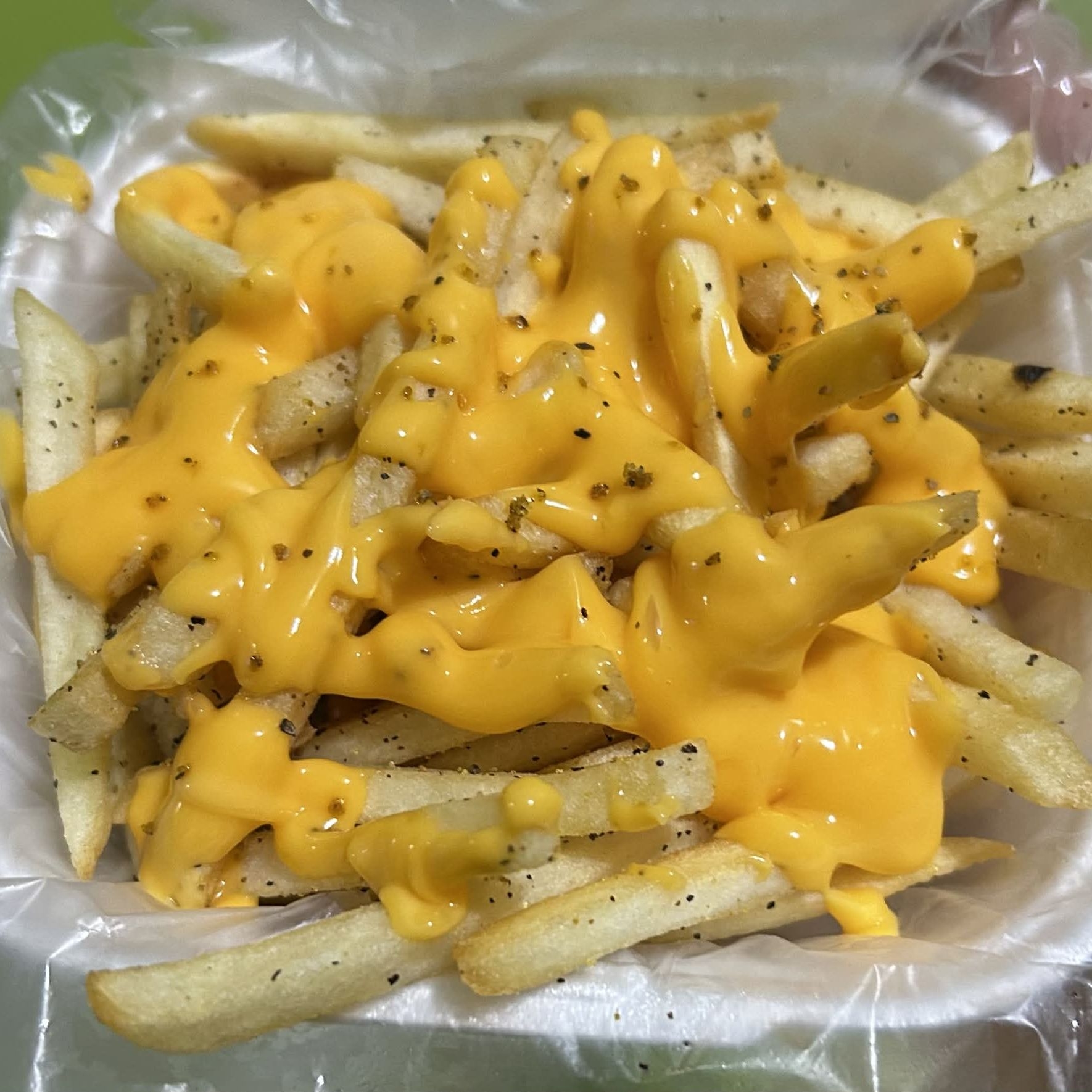 Carne al pastor, jitomate, piña, frijoles, lechuga, queso oaxaca y porción de papas a la francesa