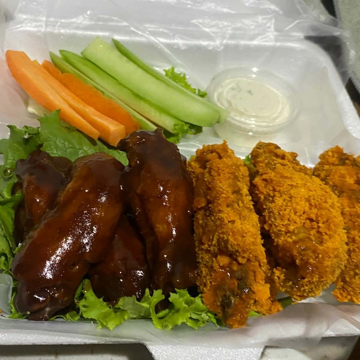 Trocitos de pechuga, bañados en salsa de tu preferencia, acompañados de pepino, zanahoria y aderezo ranch
