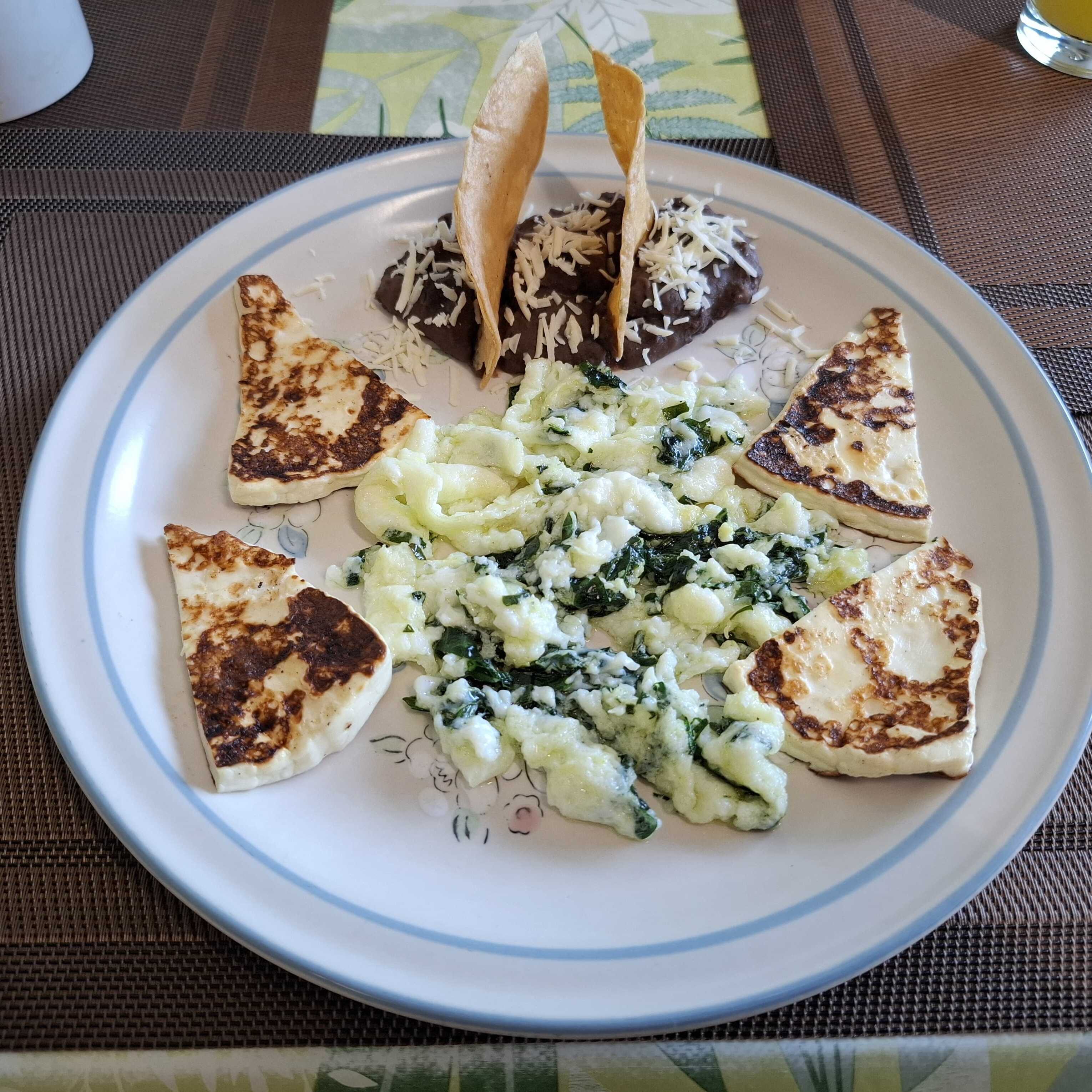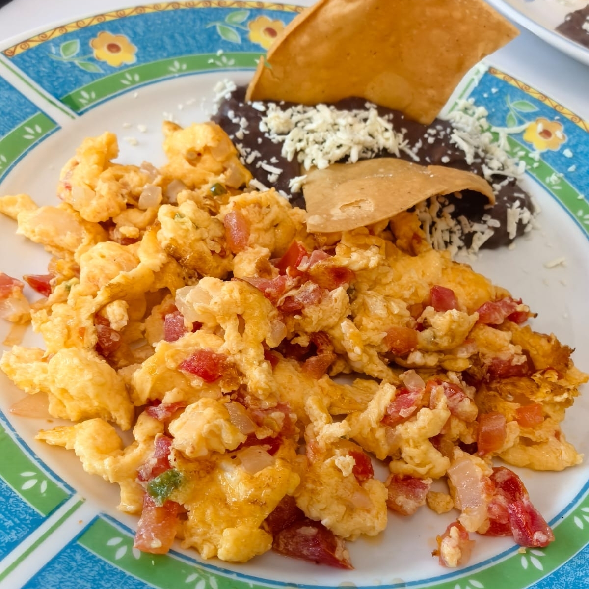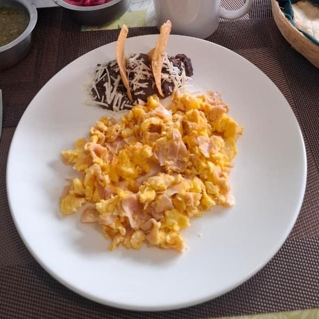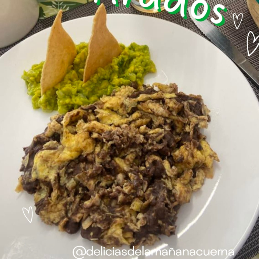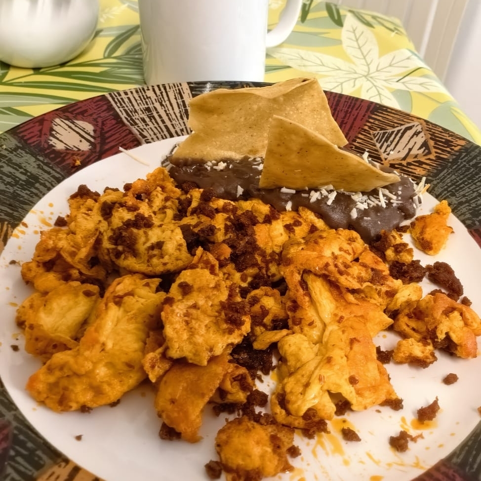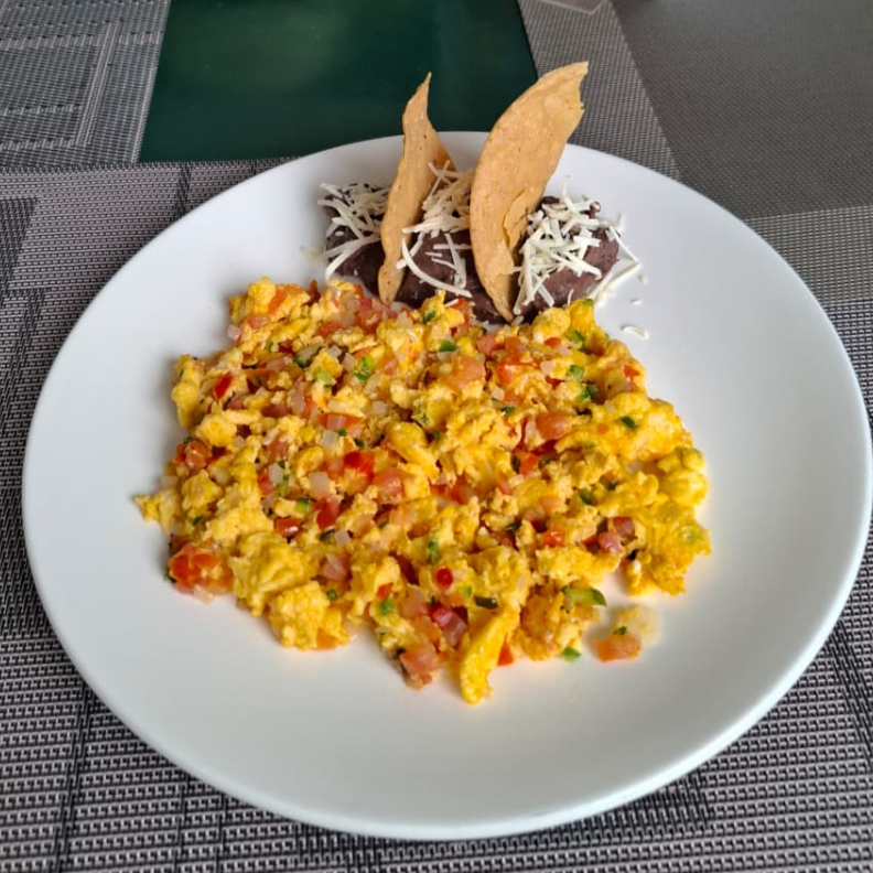 Huevos revueltos con frijoles refritos, acompañado de guacamole y totopos