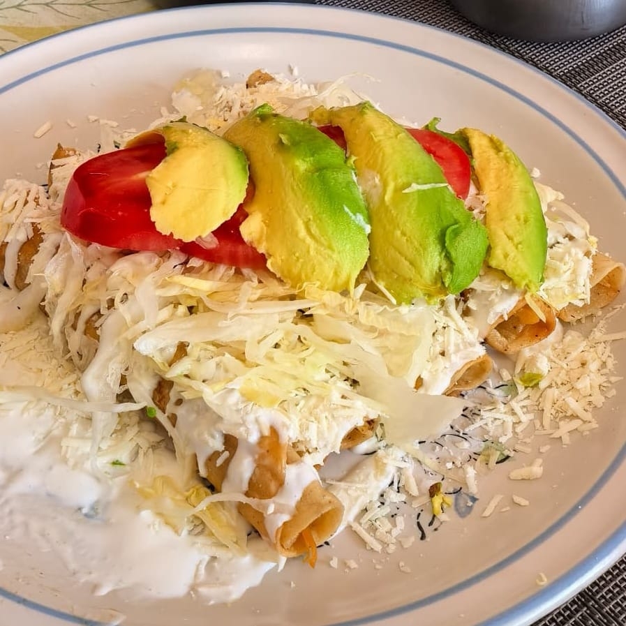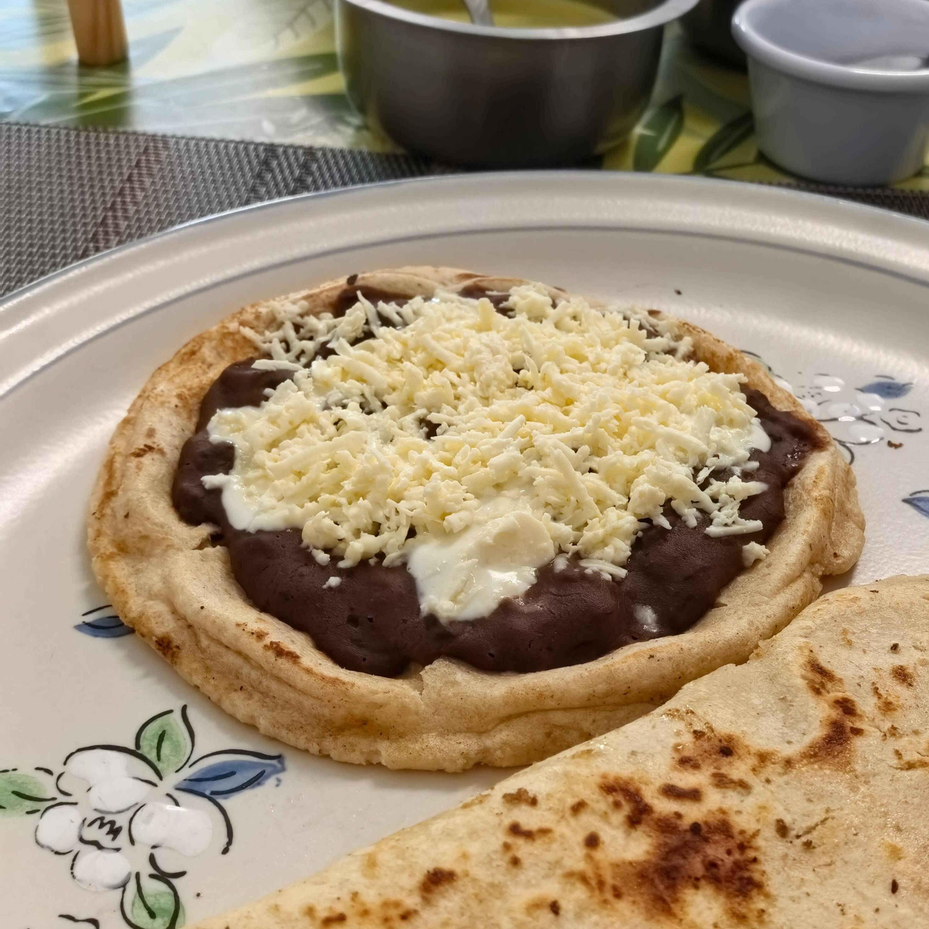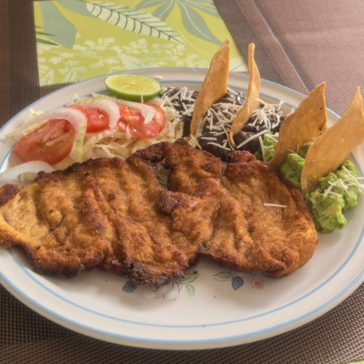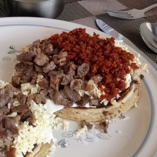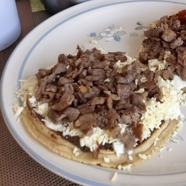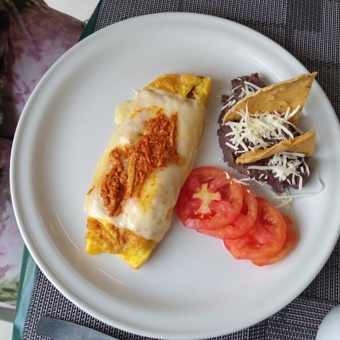 Acompañado de frijoles refritos, salsa y tortillas hechas a mano