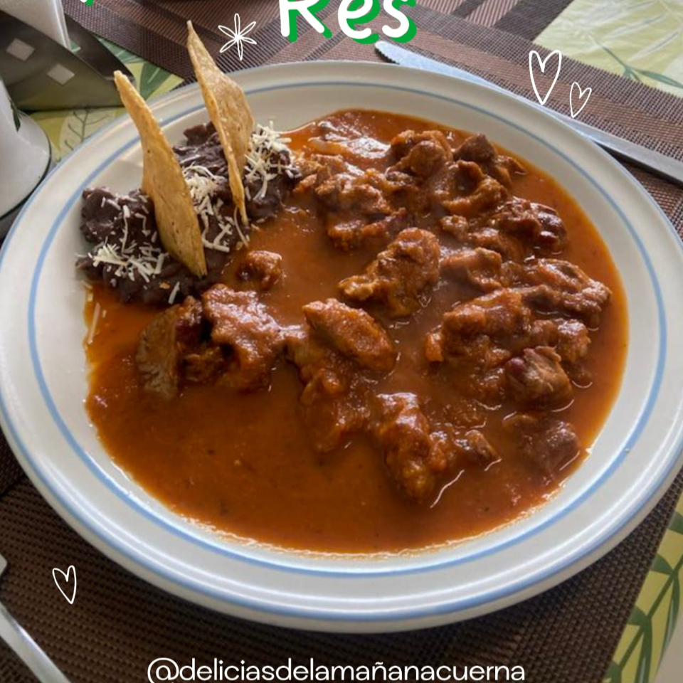 Bistec en tiras con pimiento asado, bañados en salsa ranchera acompañado de frijoles refritos