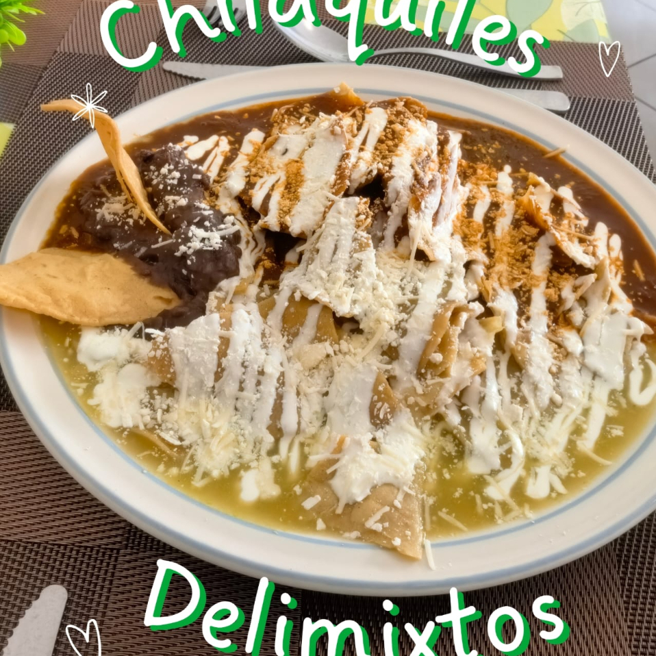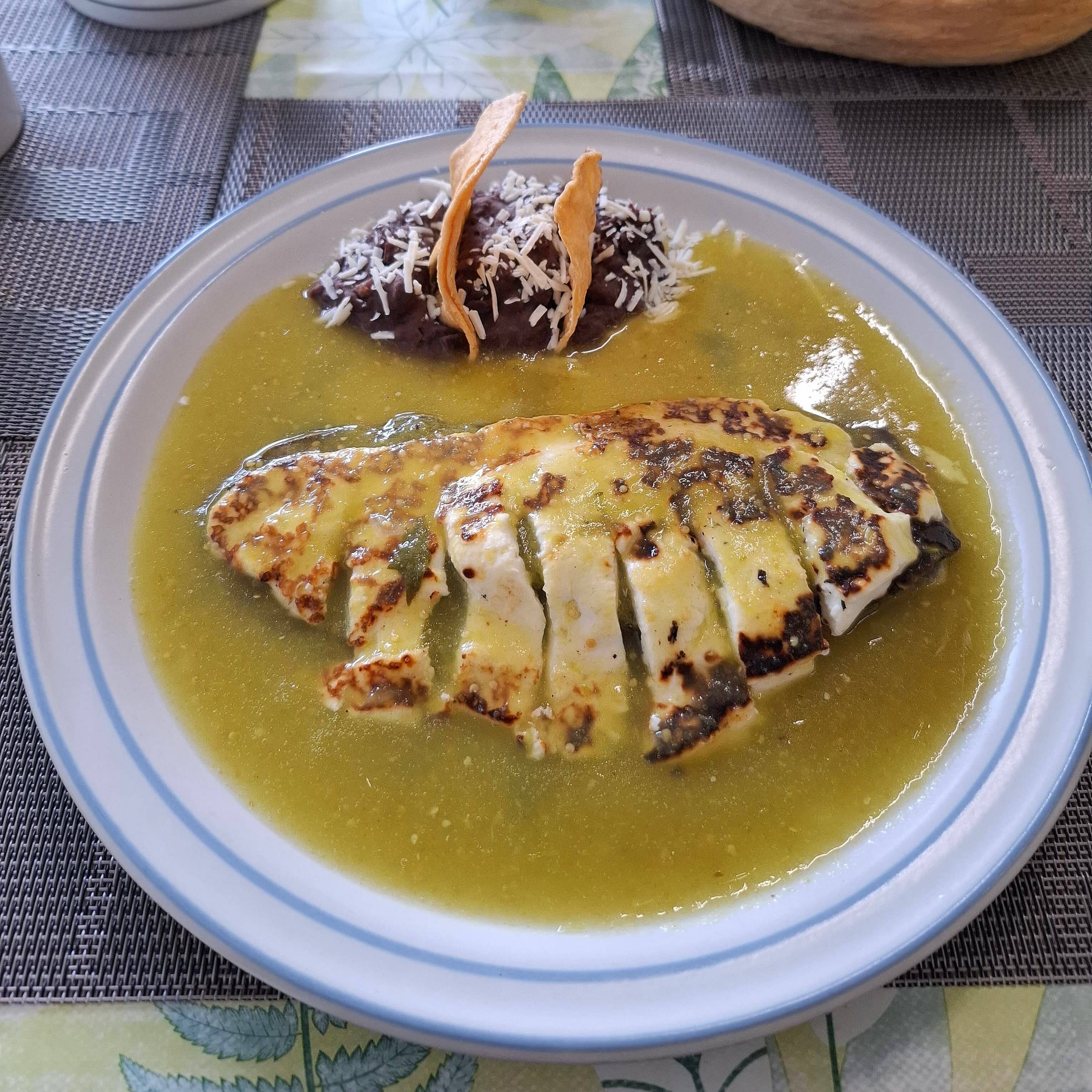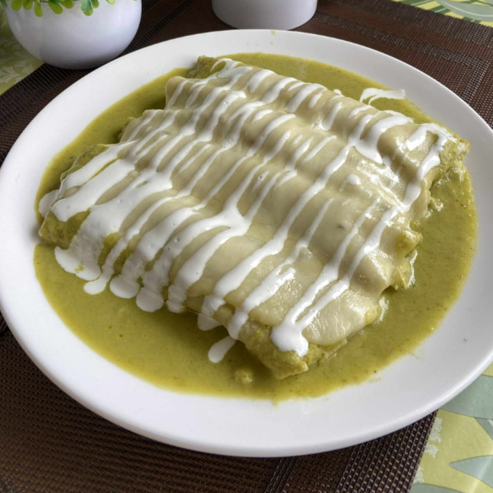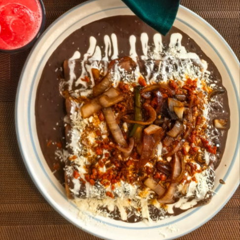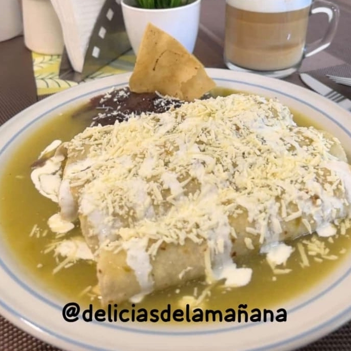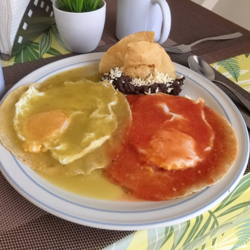 Mitad salsa verde, mitad salsa pasilla, con queso, crema y frijoles refritos