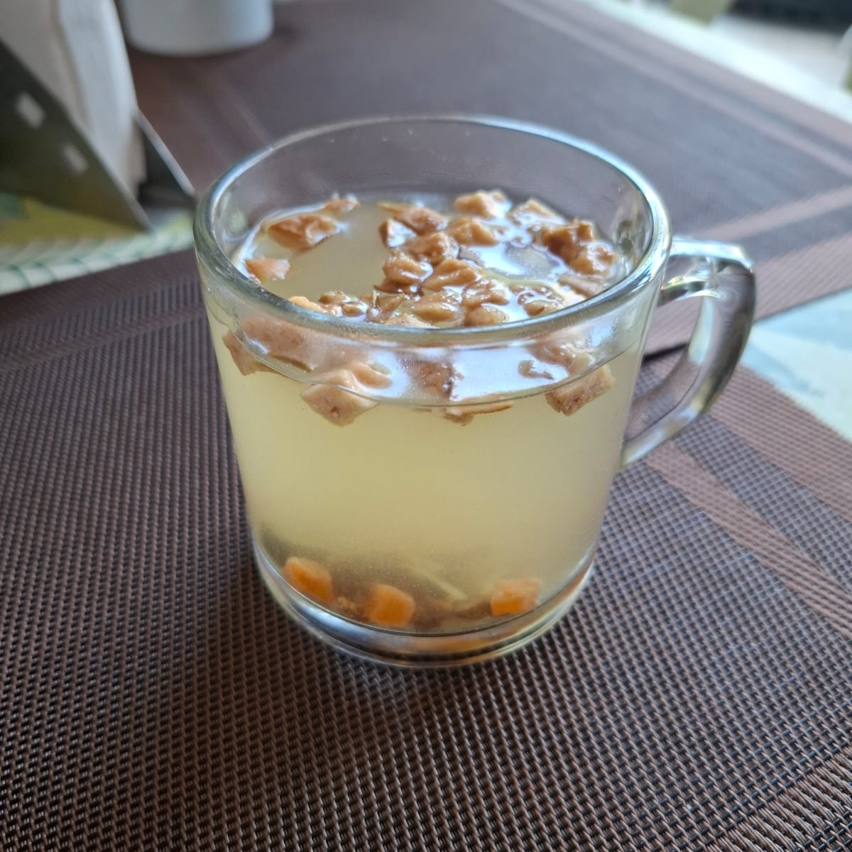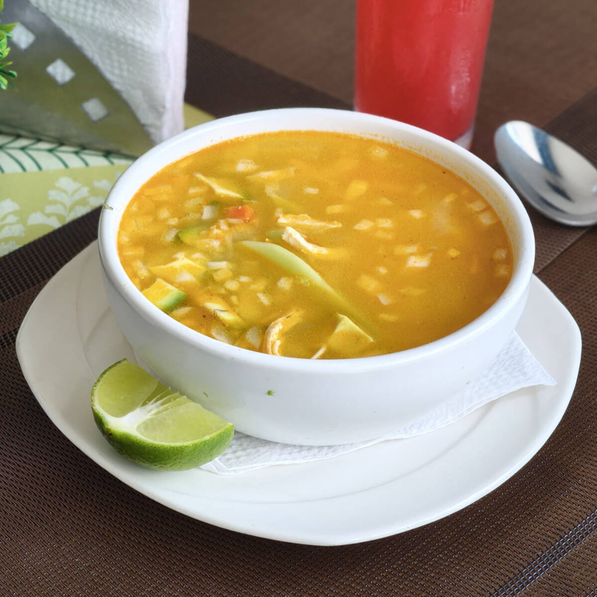Consomé de pollo, con arroz, pollo deshebrado y verduras