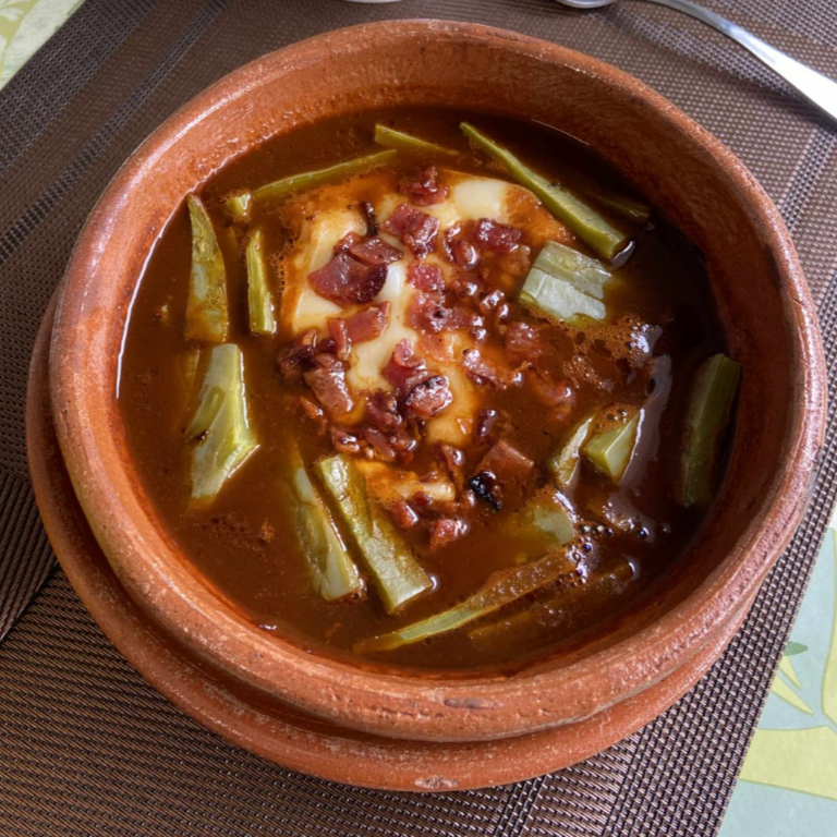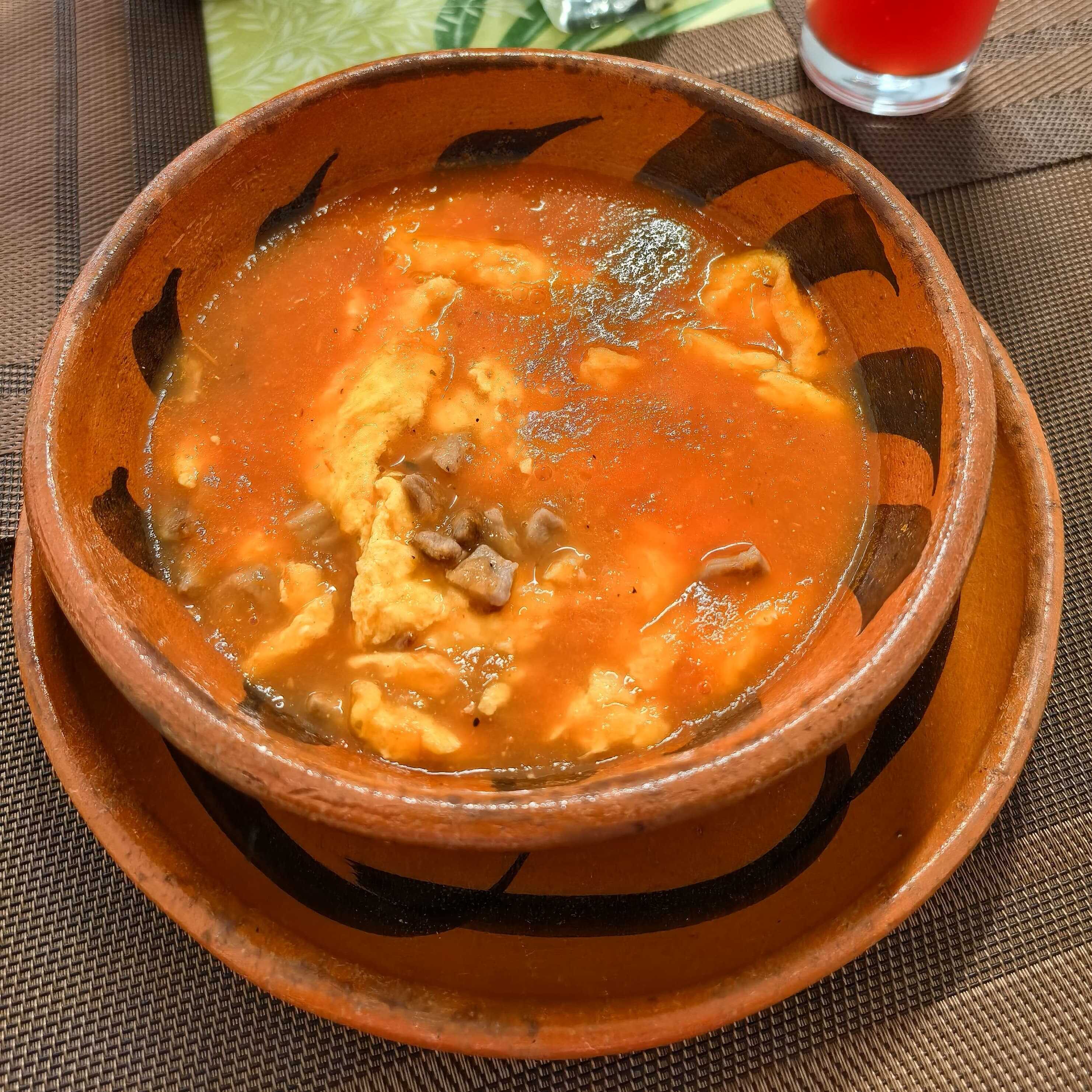 Huevos revueltos, gratinados con queso manchego, tocino y nopales en salsa pasilla