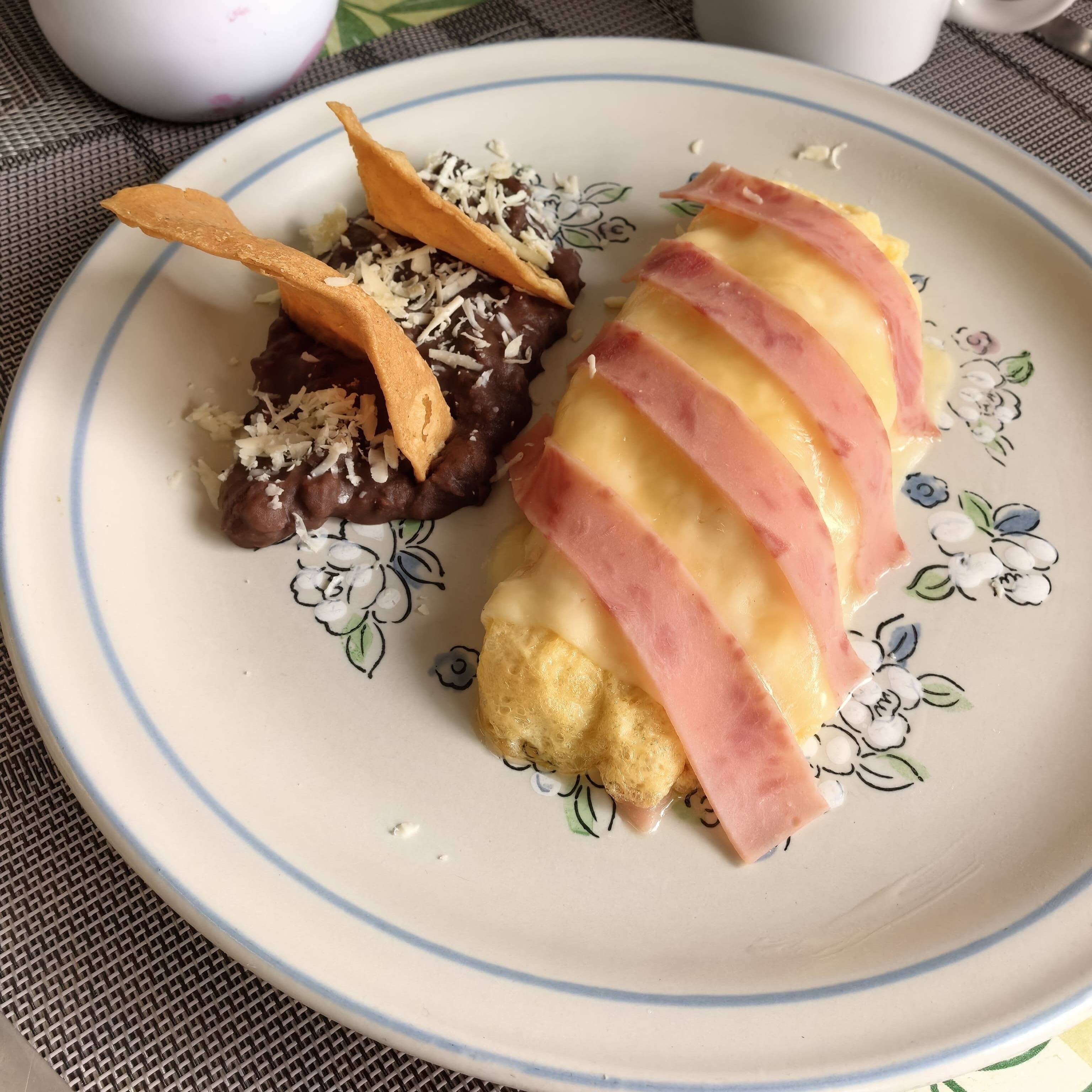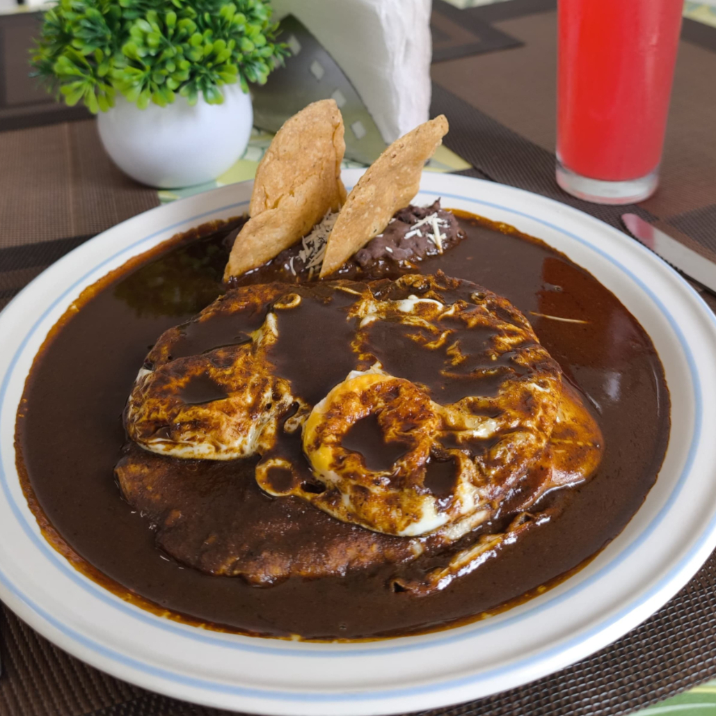 Huevos fritos montados en sincronizadas de jamón y queso, bañados en mole, acompañado de frijoles refritos