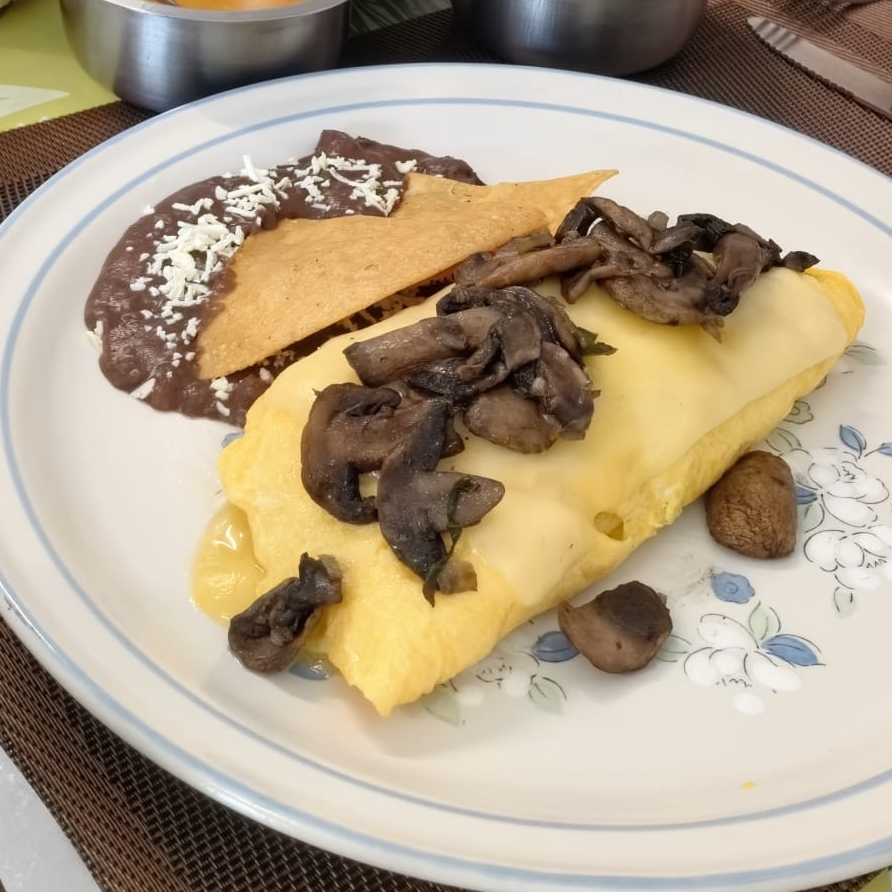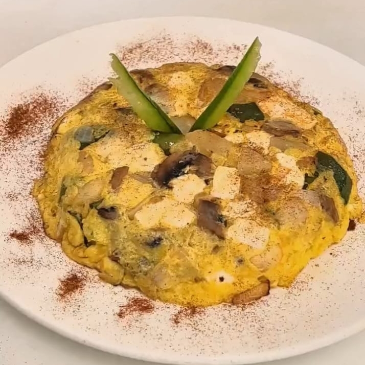 Huevo revuelto con pimiento verde, cebolla, papa en cuadros, queso panela y champiñones