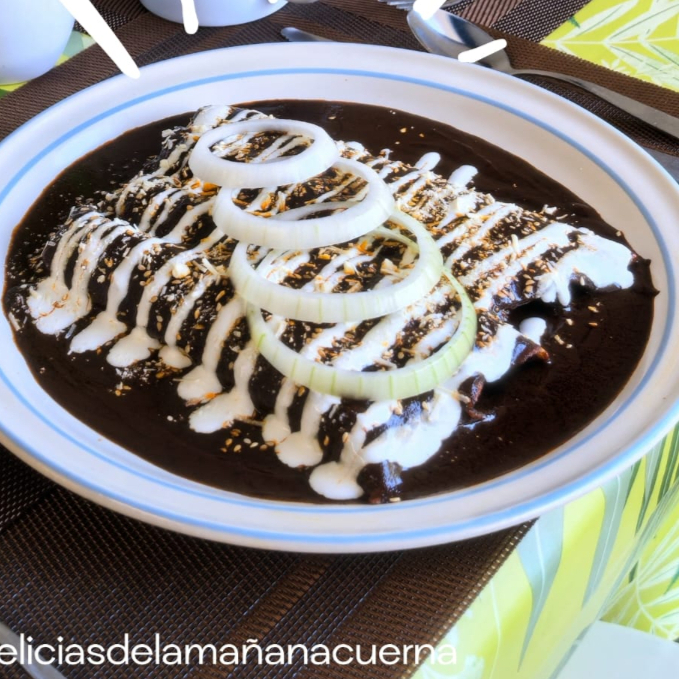 Rellenas de pollo, bañados en salsa poblana, gratinados con queso manchego