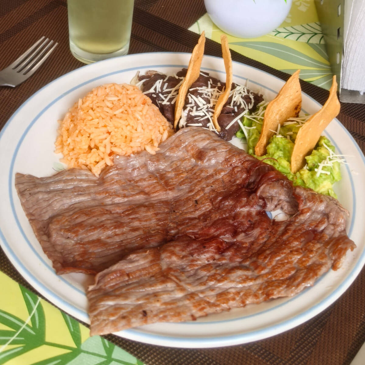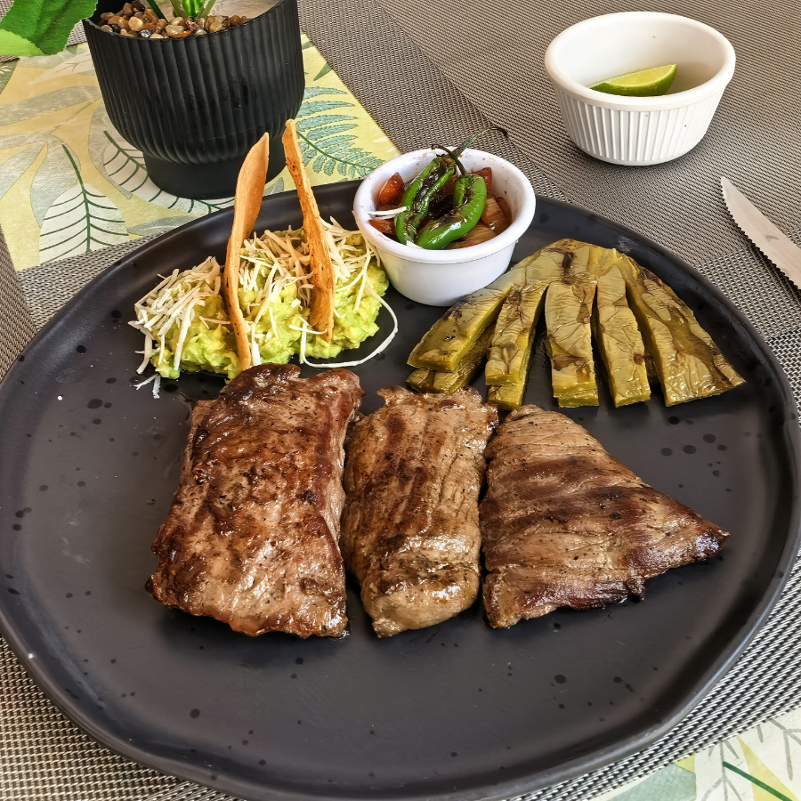Acompañado de guacamole, chiles toreados y nopal con tortillas hechas a mano