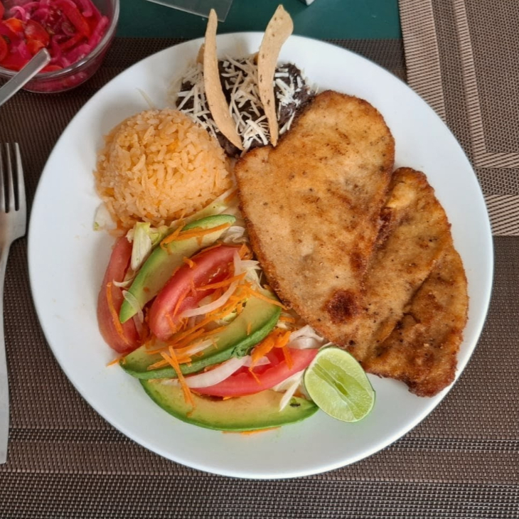 Acompañado de frijoles refritos, arroz y ensalada