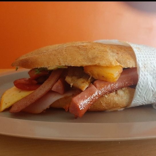 1 Torta de milanesa con pechuga de pollo marinada y empanizada, servida con mayonesa, frijoles refritos, aguacate, jitomate, cebolla y chile
