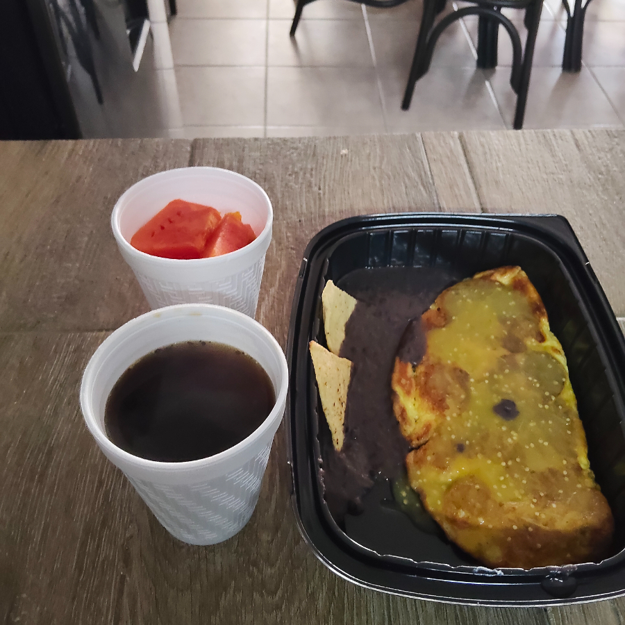 OMELETTE DE QUESO Y FRIJOLES CON FRUTA Y CAFE