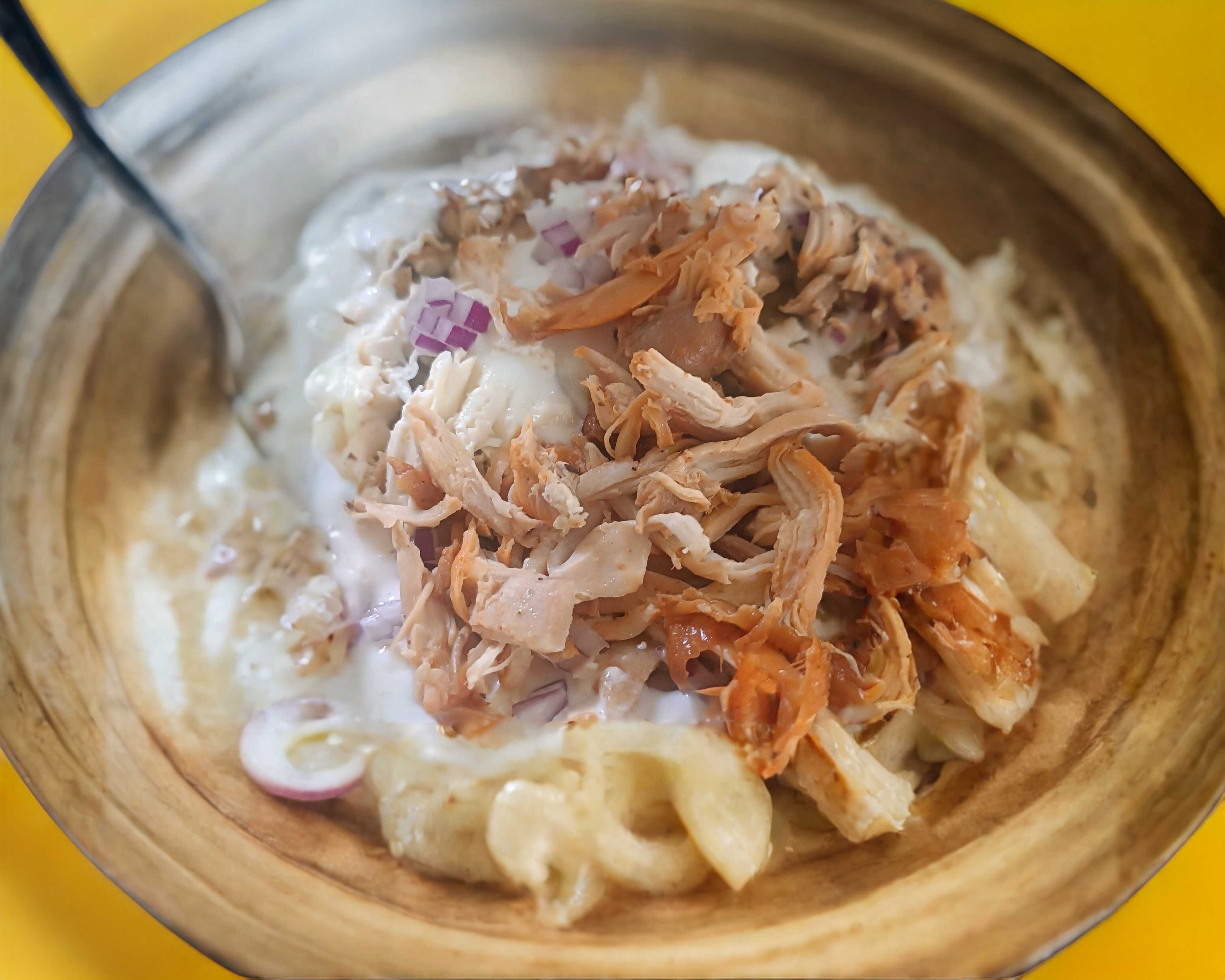Chilaquiles salsa elegir con pollo rostizado, cebolla, queso, crema y bolillo.