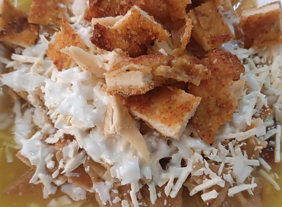 Chilaquiles salsa a elegir con milanesa, cebolla, queso, crema y bolillo.
