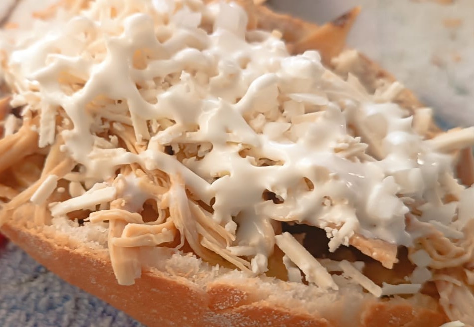 Bolillo relleno de chilaquiles salsa a elegir, pollo, cebolla, queso y crema.