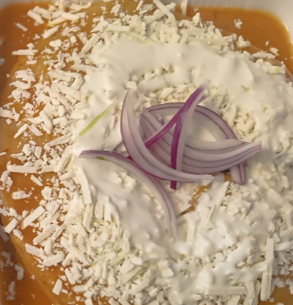 Enchiladas rellenas de pollo bañadas en frijol, con queso, cebolla y crema.