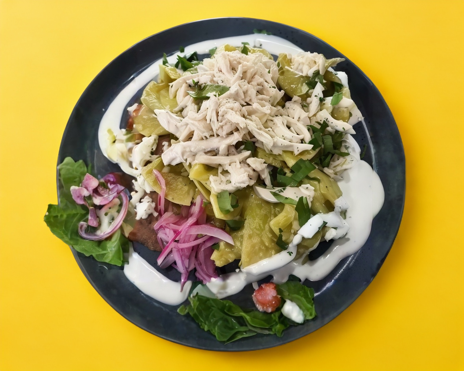 Chilaquiles salsa a elegir acompañados de pollo deshebrado, cebolla, queso, crema y bolillo.