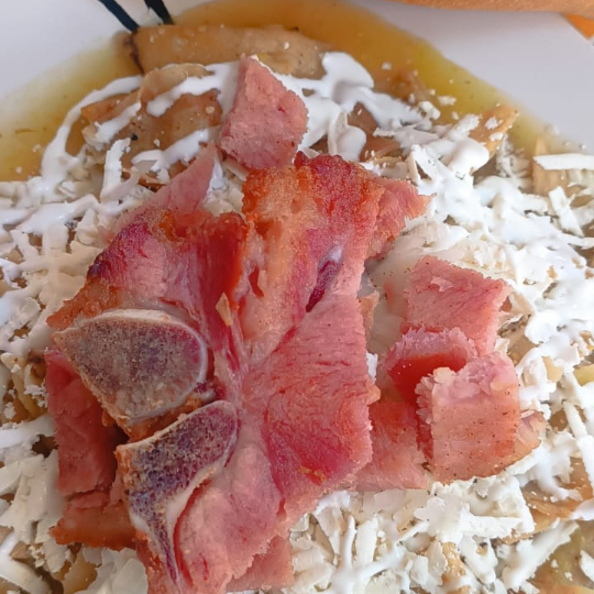 chilaquies verdes o rojos acompañados de chuleta ahumada